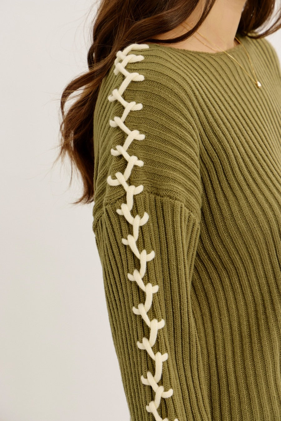An easygoing oversized rib-knit sweater with a little extra edge. This relaxed silhouette features contrast stitch detailing along the sleeves, adding just the right amount of visual interest without taking over the look.