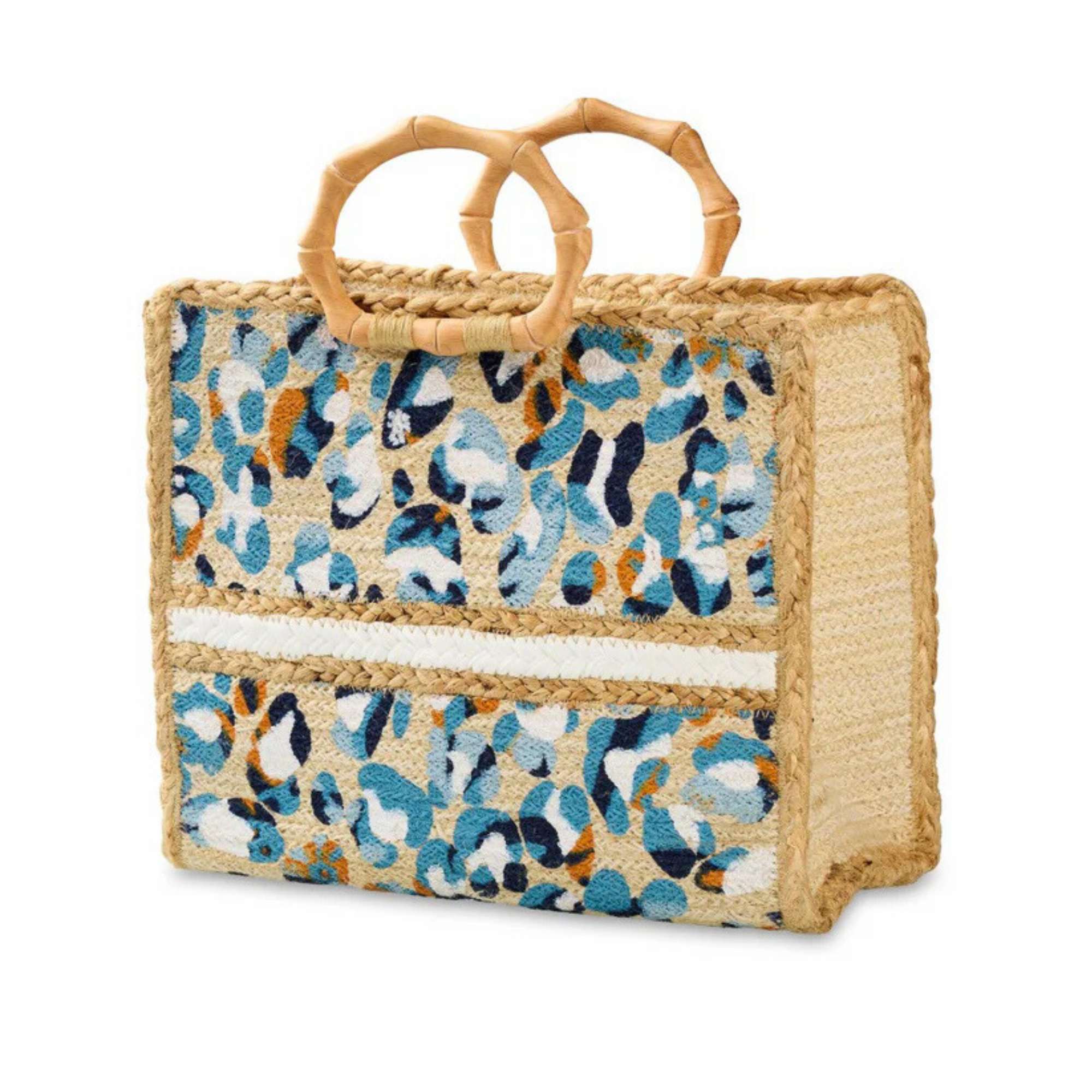 Take a walk on the wild side with our Animal Instinct Jute Tote Bag. This playful carryall pairs an abstract animal print in blue, white and camel with a crisp white stripe for a look that feels equal parts city chic and coastal escape. The structured oval bamboo handle adds an instant island vibe and a touch of natural texture, while the roomy jute straw body keeps things light, airy and easy to carry all day.