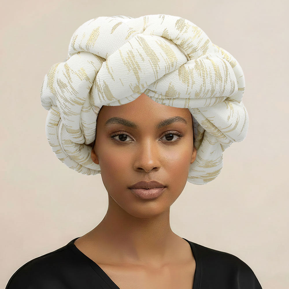 Statement braided padded head wrap turban featuring a thick knot design and full wrap style for standout volume. Soft, comfortable fit ideal for fashion styling, cultural wear, or special events. Adds bold texture and elevated flair to any outfit.