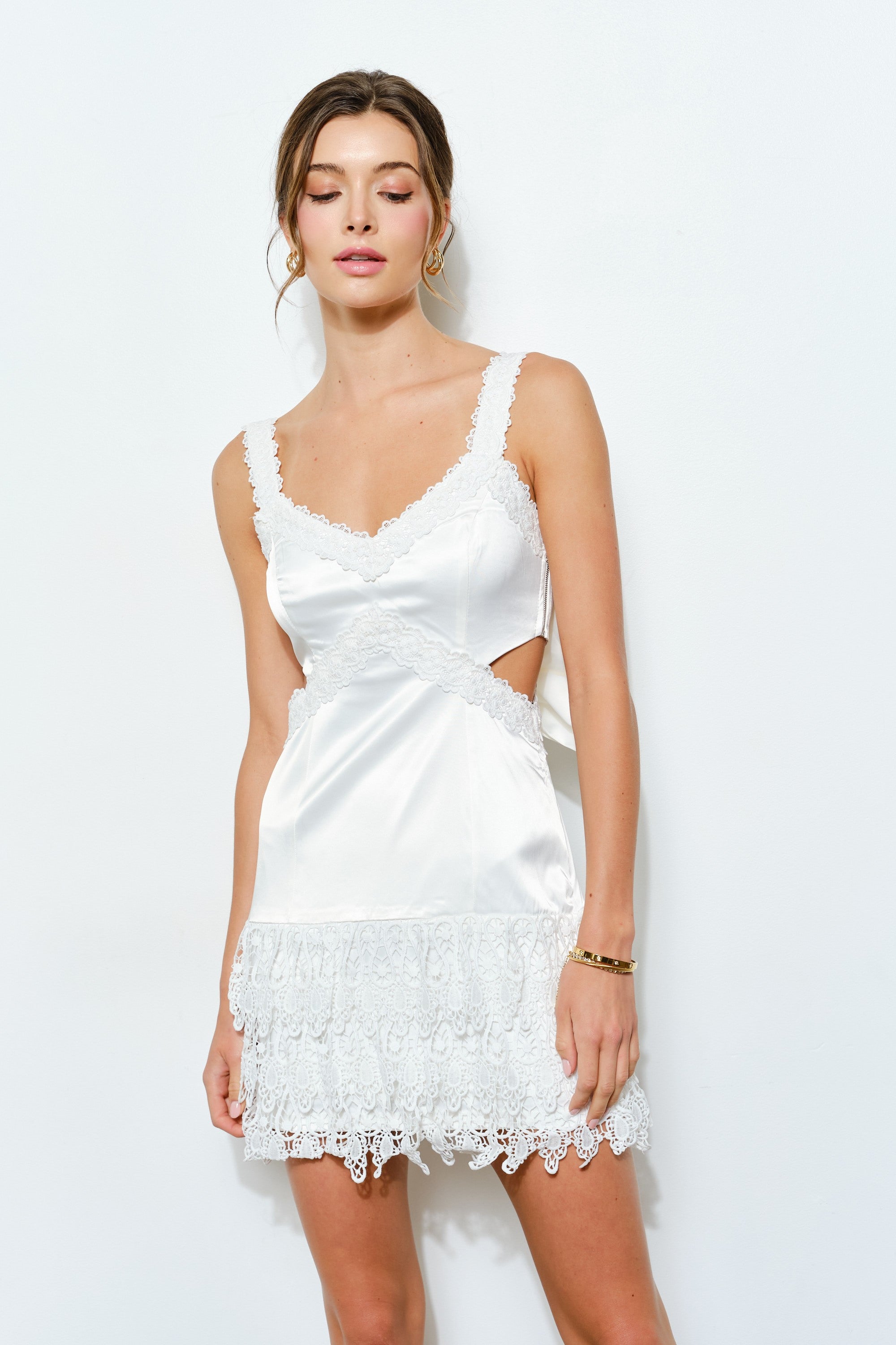 A satin mini with lace-trimmed sweetness and a back bow that could stop traffic. This dress blends romantic details with a modern silhouette, giving you a piece that's feminine, flirty, and impossible to ignore.
