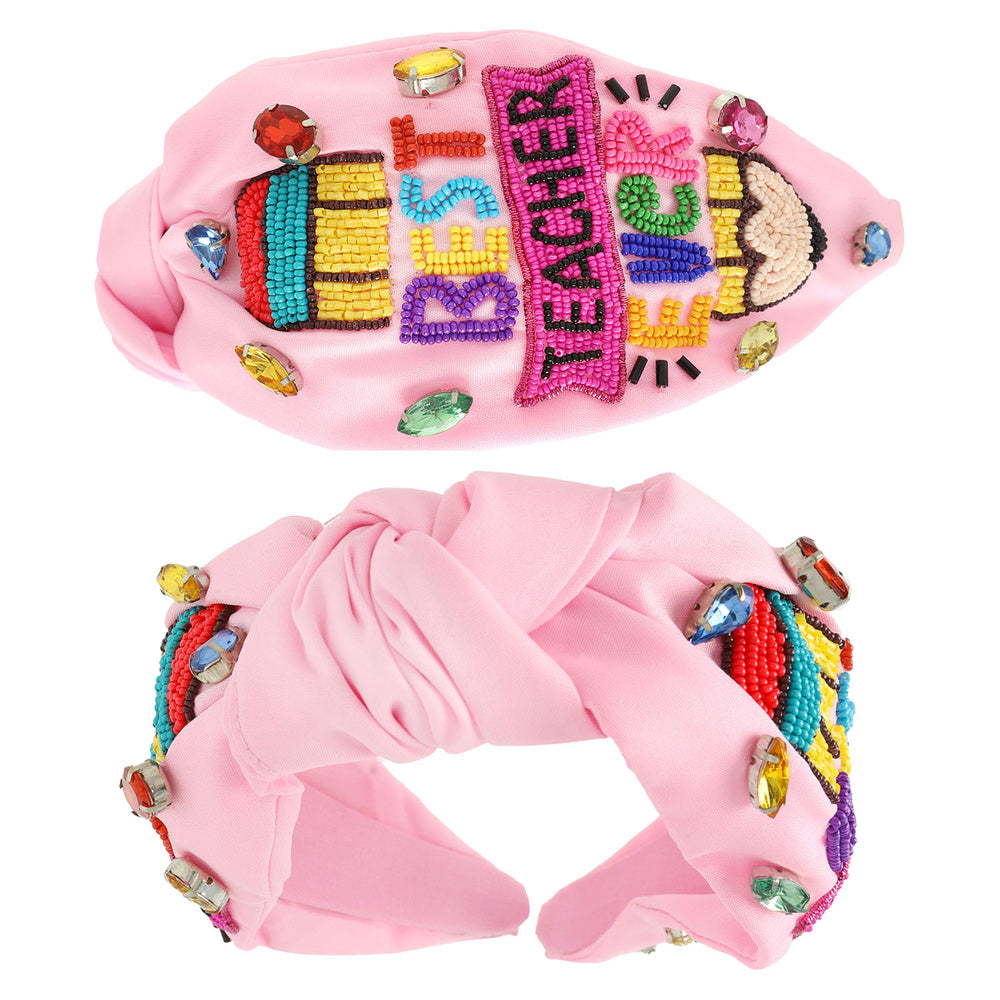 Best Teacher Pink Beaded Crystal Top Knot Headband