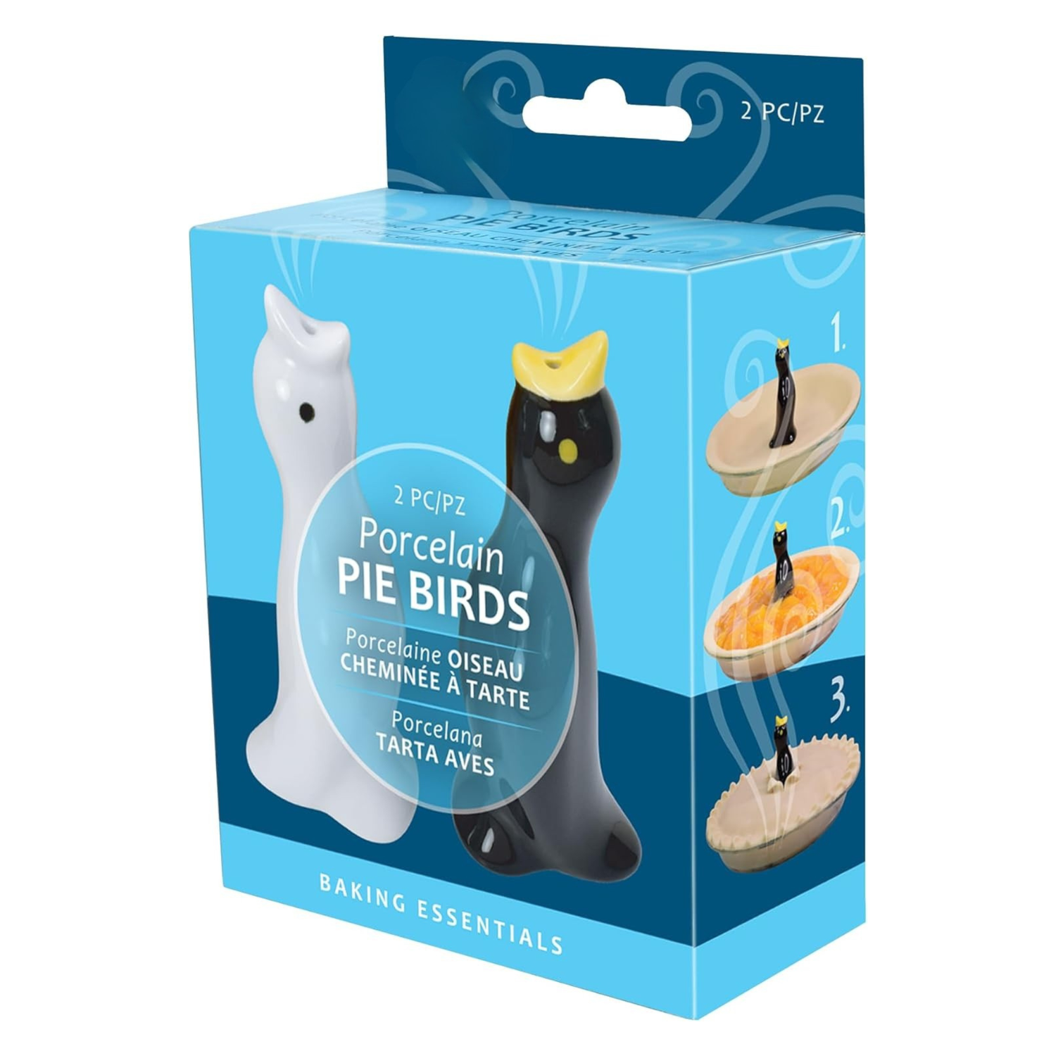 Set of 2 fine porcelain pie birds Includes 1 black and 1 white Place bird in center of pie before baking to prevent cracked crusts and dripovers During baking, steam escapes through the birds mouth to eliminate cracked crusts and dripovers Dishwasher safe