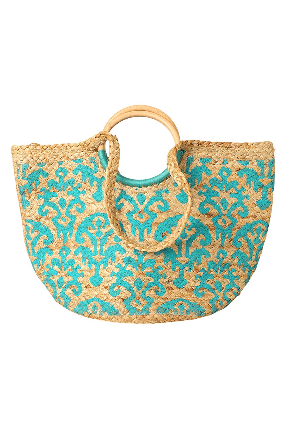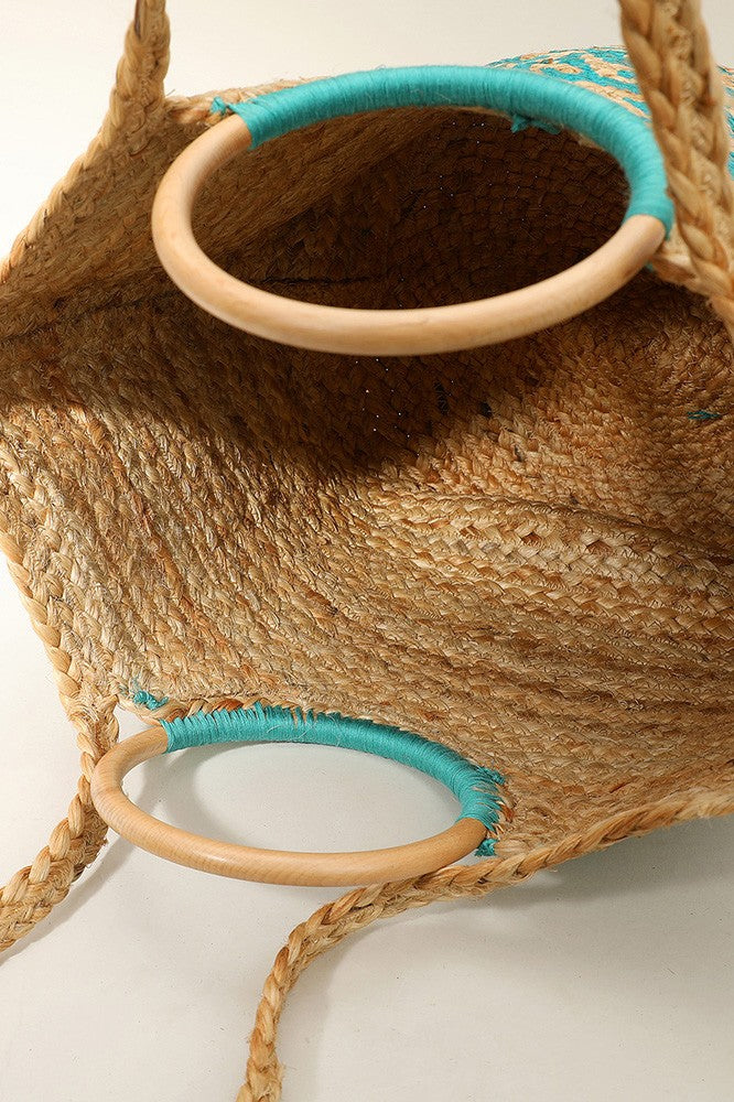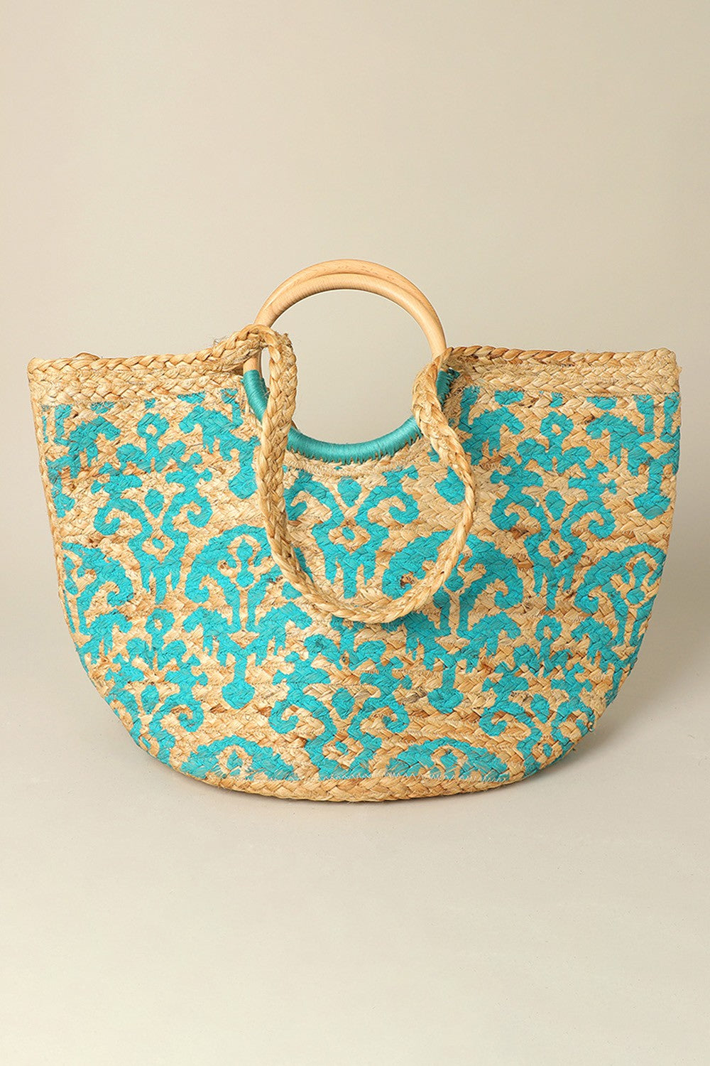 Boho Marketplace Woven Tote Bag Stylish and spacious, this woven tote bag features an intricate embroidered pattern and sturdy circular handles. Perfect for beach days, shopping, or casual outings, it blends fashion and function for an effortlessly chic look. Lightweight and easy to carry all day. Size : 18.5" X 12" X
