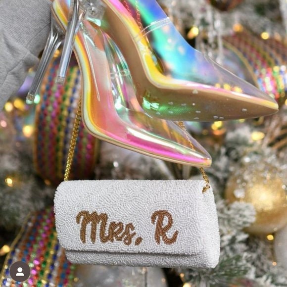 BRIDE Wedding Bridal Crossbody Chain Clutch Handbag White Gold Beaded Bag
