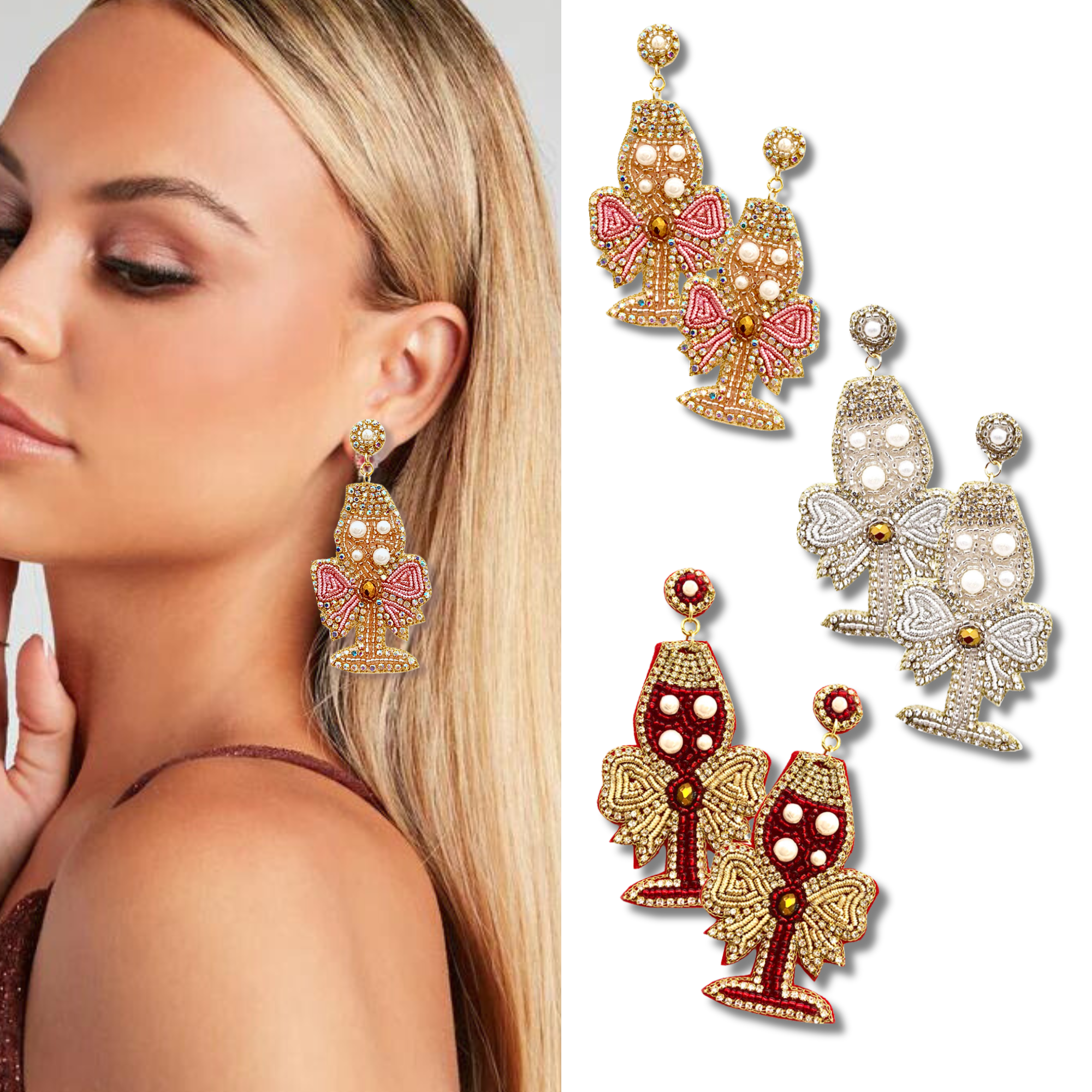 Champagne Flute Pearl Seed Beaded Crystal Earrings