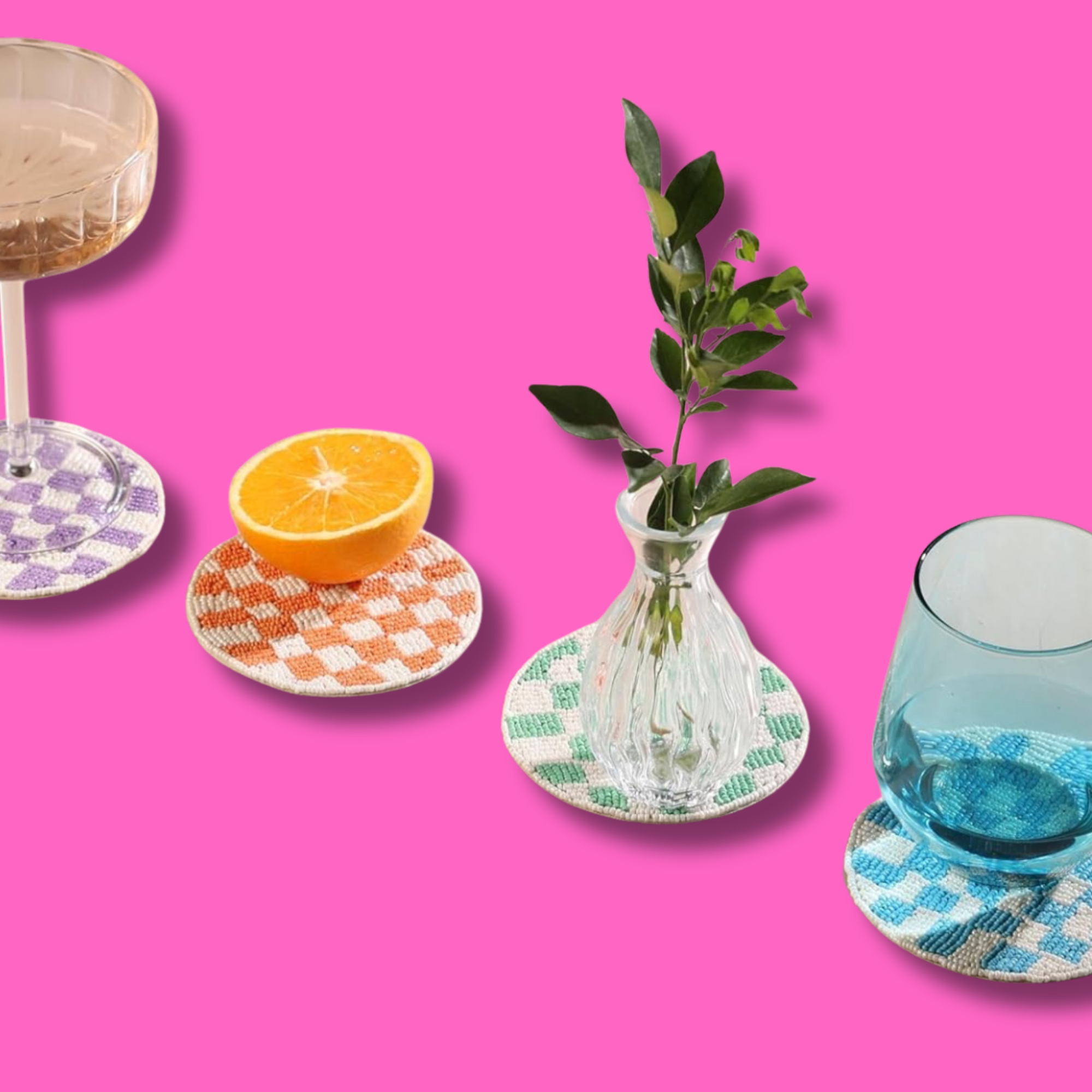 These beaded coasters are handcrafted and add a touch of art and style to your tableware. The coasters feature a colorful checkered design in a 4-inch standard design. The beading is intricate and catches the light.