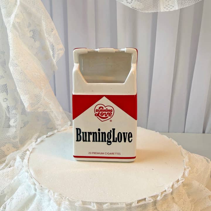 This ash tray brings some perfect vintage vibes. Made entirely of substantial ceramic, this ash tray is decorated to look like a box of your favorite cigs.