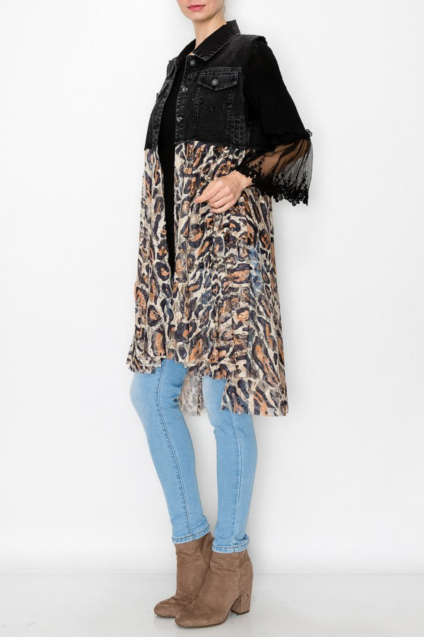 Deidre Denim Vest Boho Lace Hem in Black Leopard
