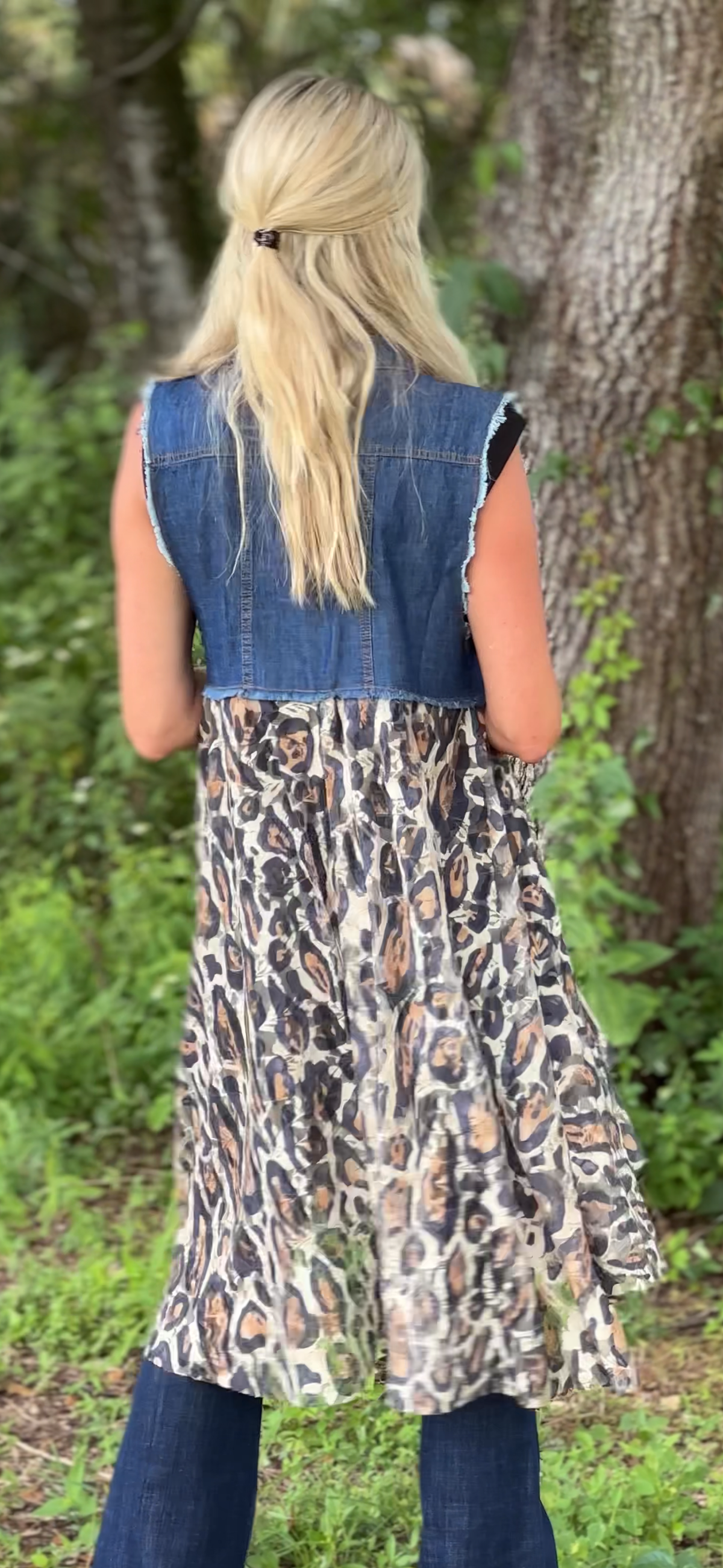 Deidre Denim Vest Boho Lace Hem in Blue Leopard
