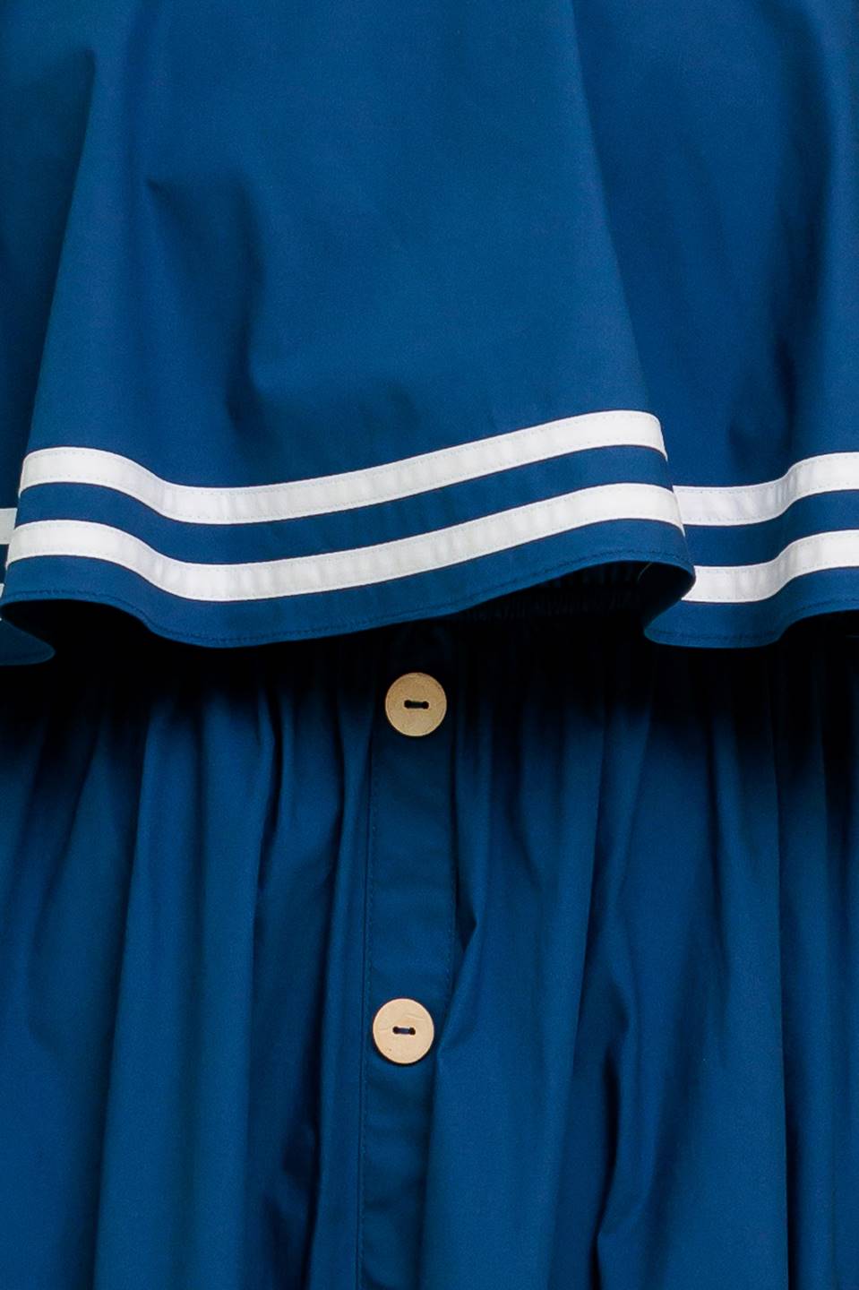 A solid navy woven midi dress featuring U neckline, straps, pop over, and button down skirt