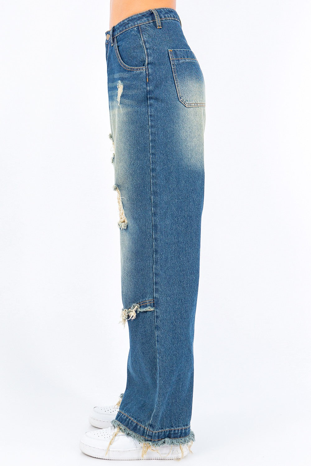 - Hem: Frayed hem + distressed trims for subtle texture
