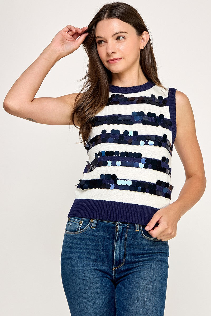 A cozy knit with a little main-character sparkle. ✨ This sleeveless sweater top pairs classic navy-and-ivory stripes with shimmering sequin embellishment, so you look festive without looking like you tried too hard (even though you absolutely did).