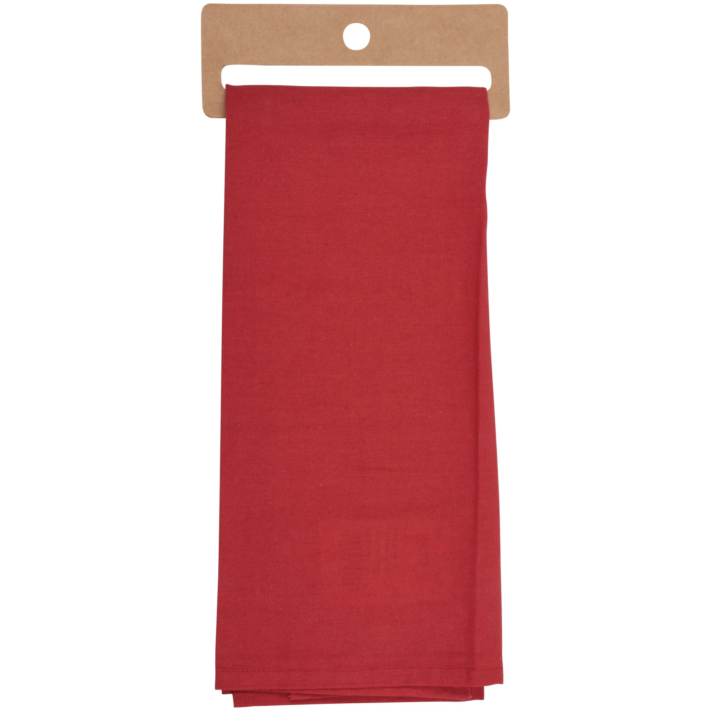 A red cotton kitchen towel from our farmhouse collection featuring a stitched art panel and embroidered sentiment. Art panel displays vintage art of a cow, pig, and rooster stacked on each other with humorous sentiment that reads "A Cow, A Pig, And A Chicken Walk Into A BBQ... The End." Our Walk Into A BBQ kitchen tow