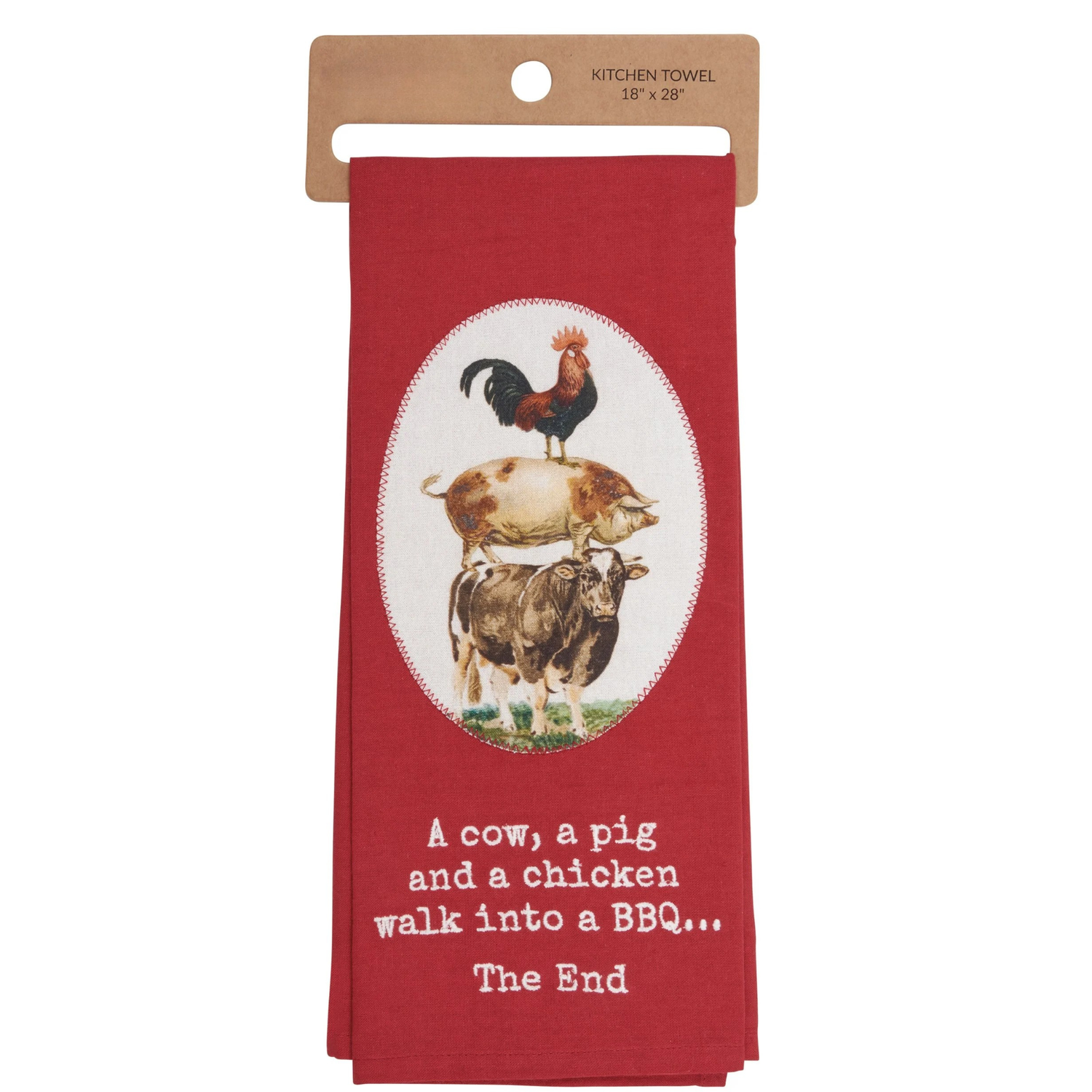 A red cotton kitchen towel from our farmhouse collection featuring a stitched art panel and embroidered sentiment. Art panel displays vintage art of a cow, pig, and rooster stacked on each other with humorous sentiment that reads "A Cow, A Pig, And A Chicken Walk Into A BBQ... The End."