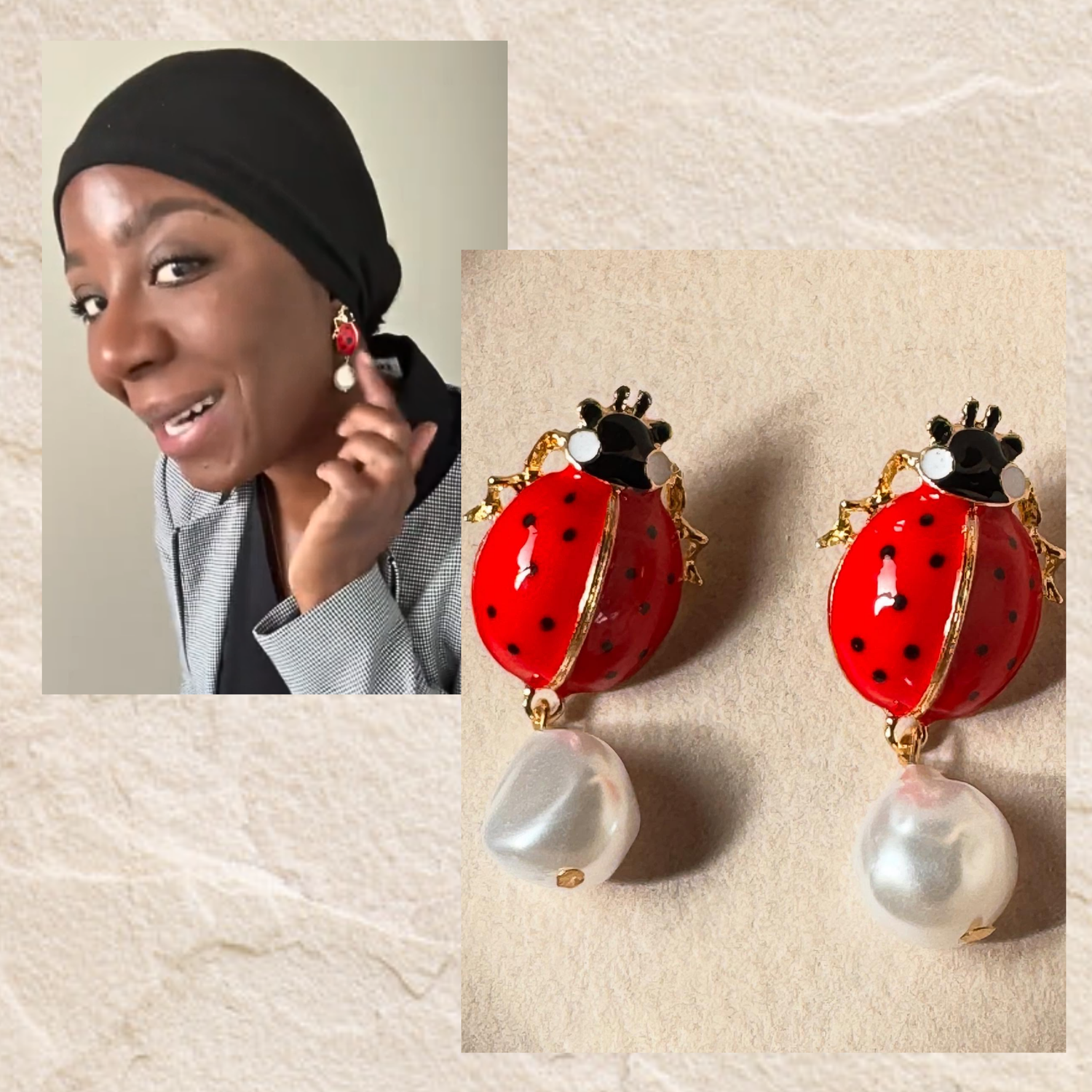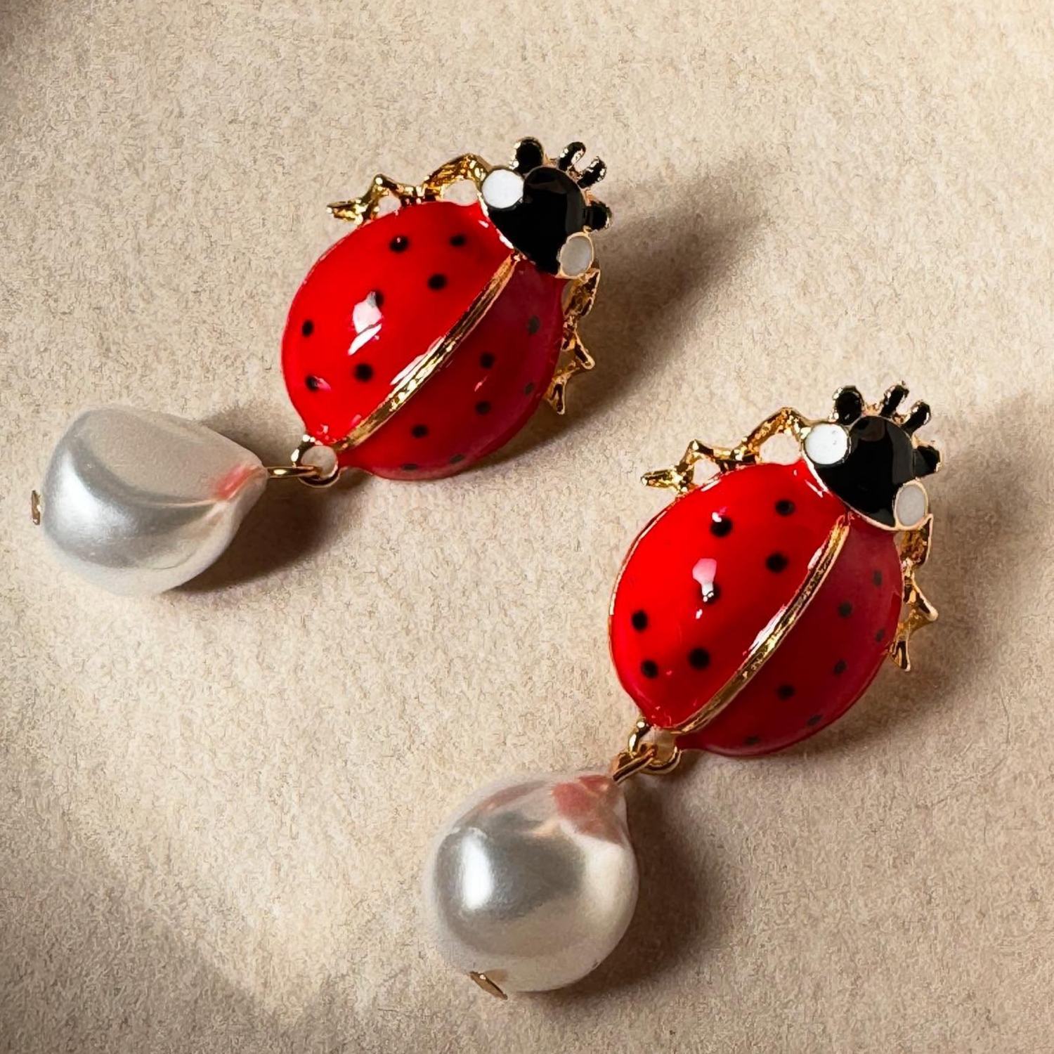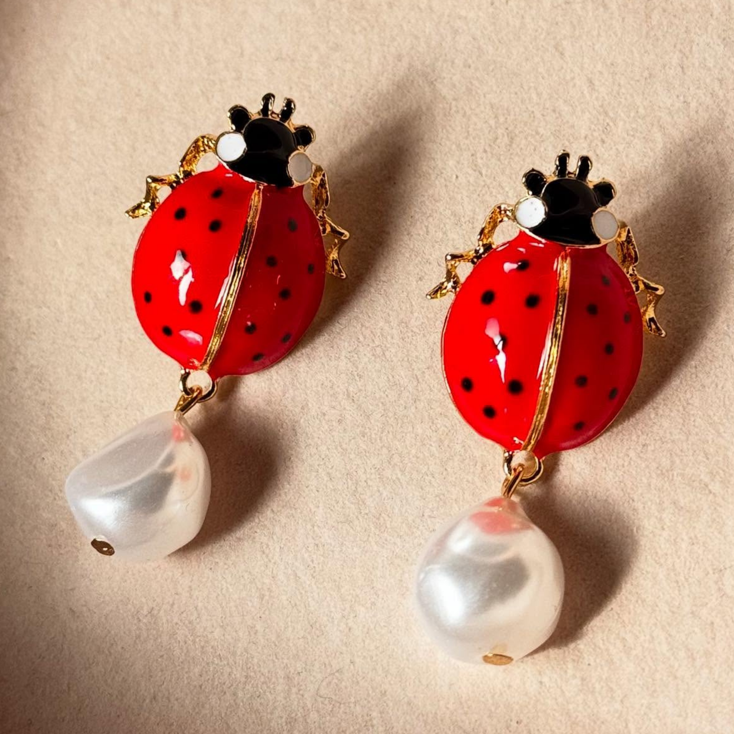 #ladybugearrings #pearldropearrings #boldstatementearrings #whimsicaljewelry #funfashion #noveltyearrings #natureinspiredjewelry