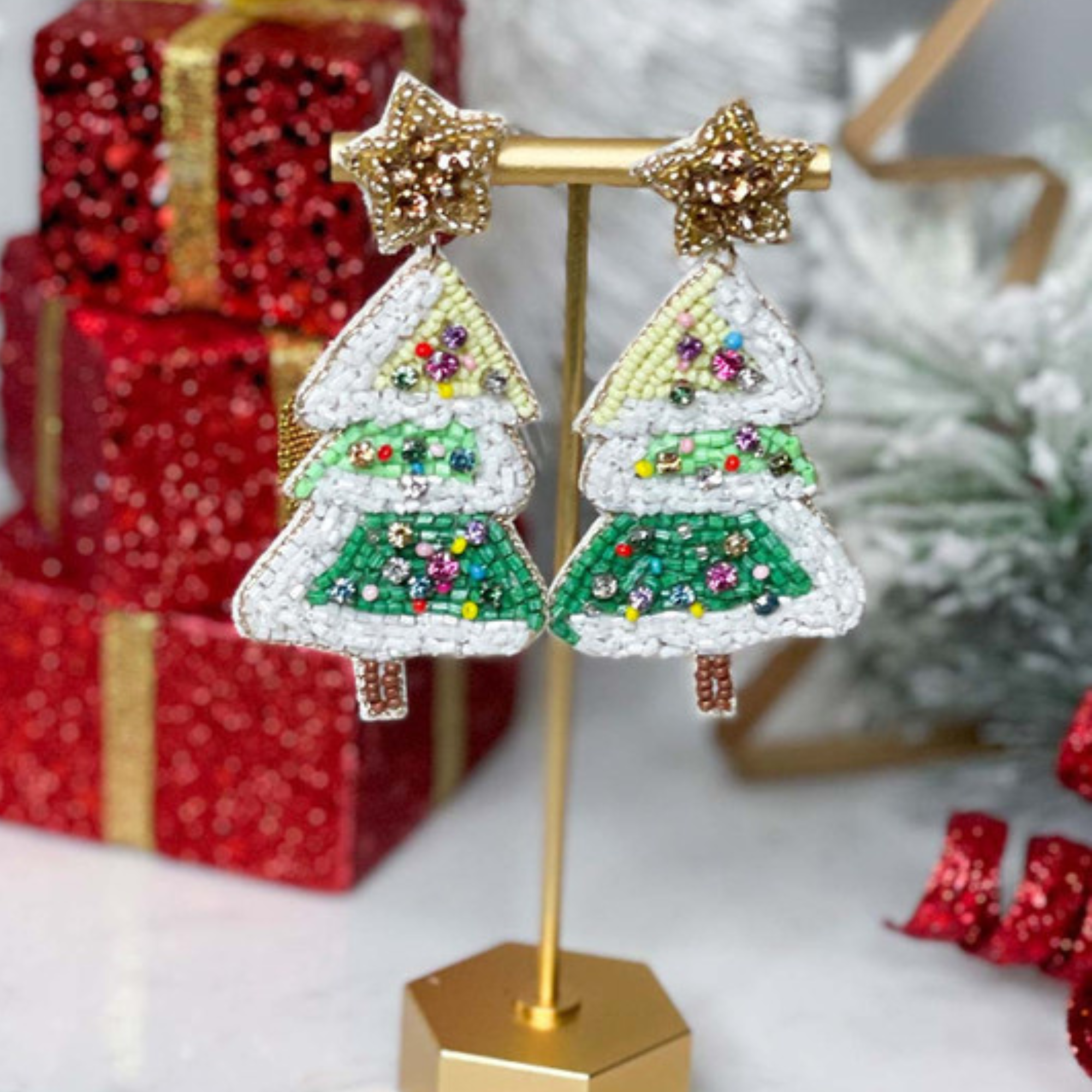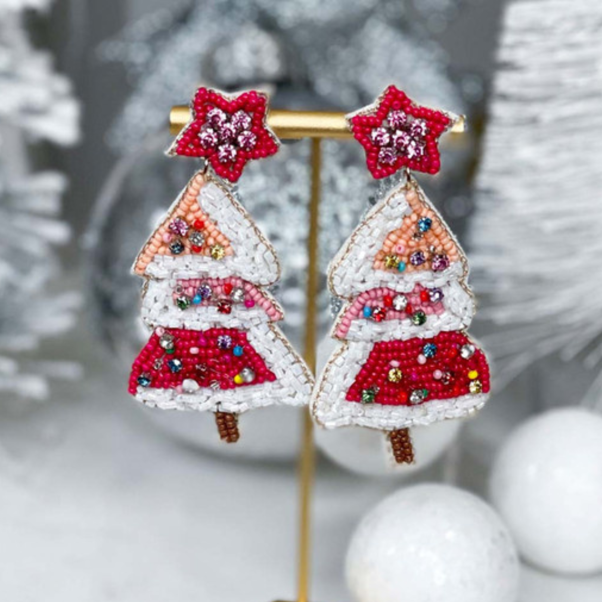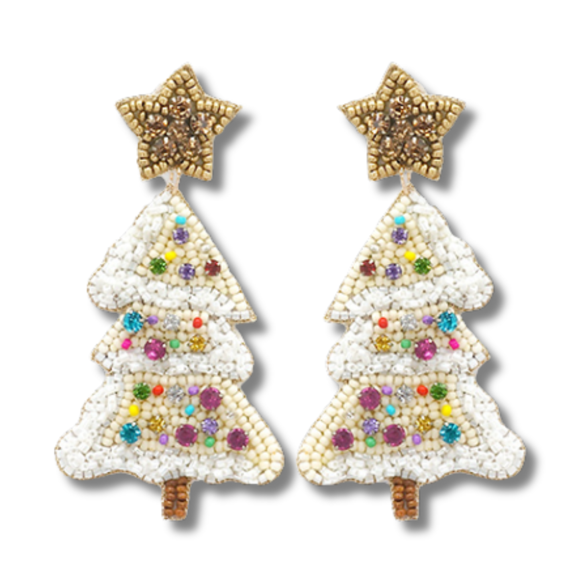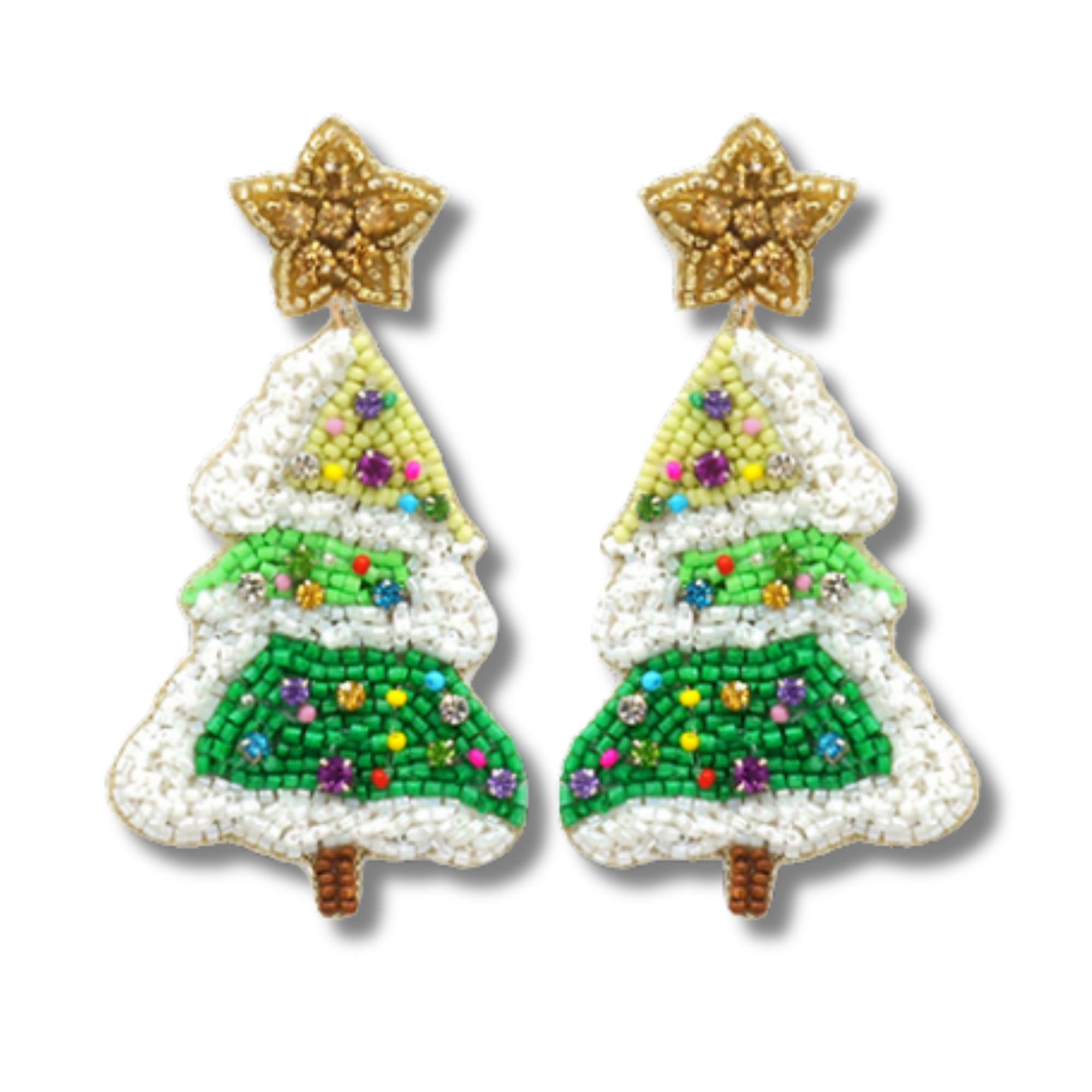 Frosted Snow Christmas Tree Crystal Beaded Artisan Earrings