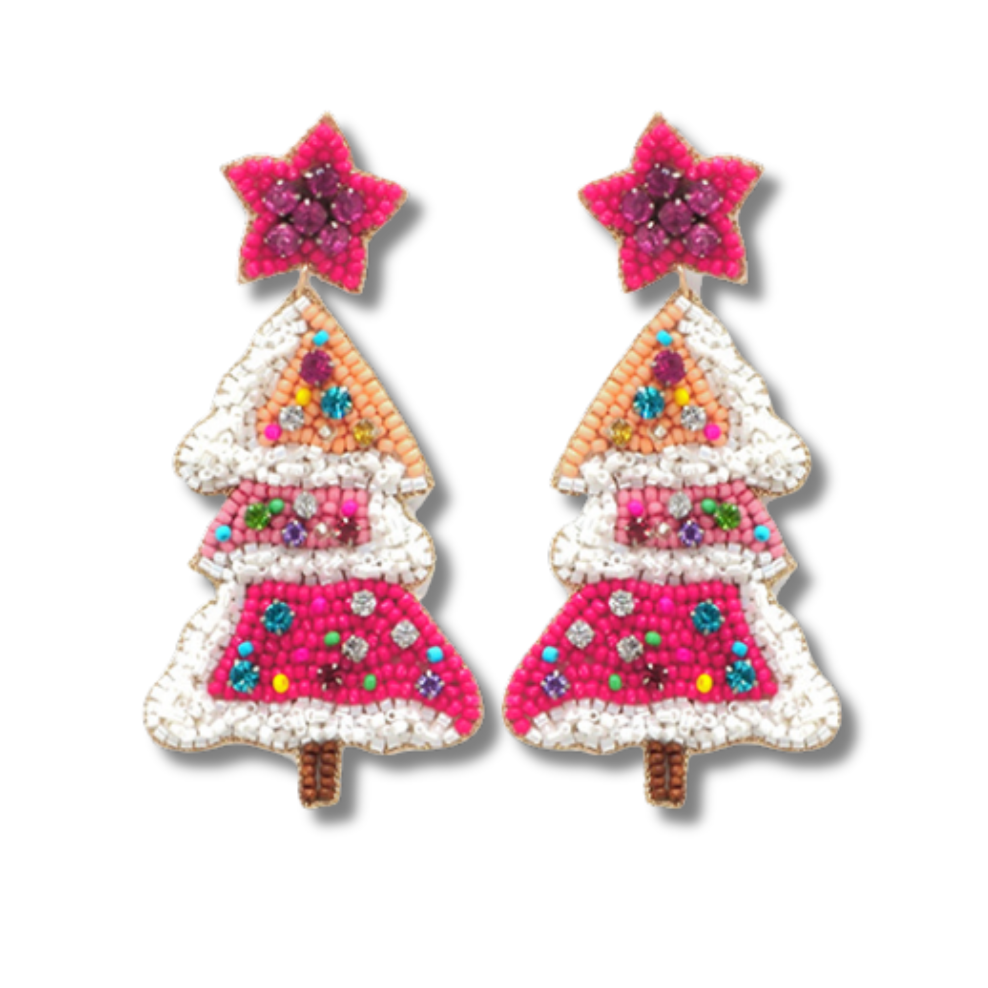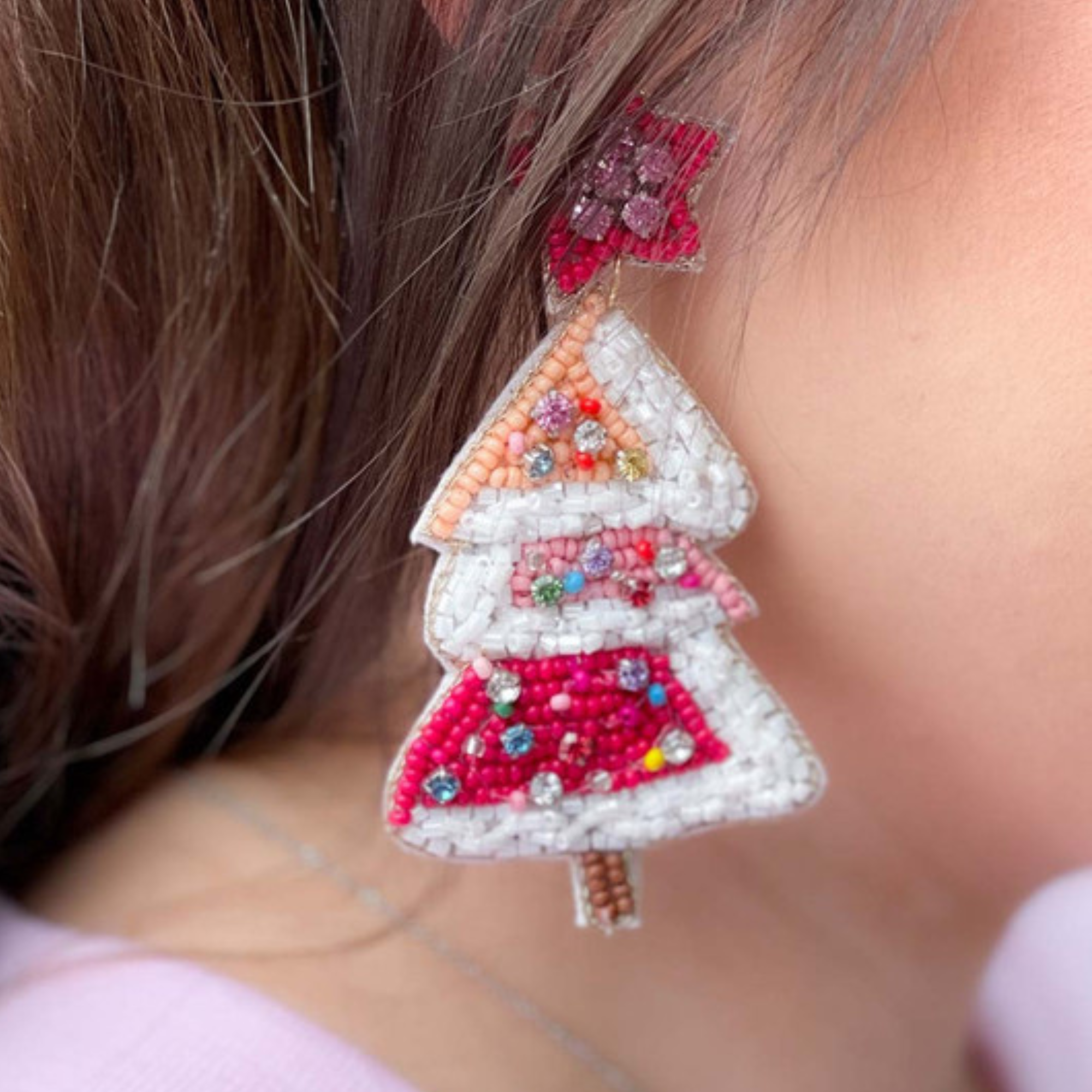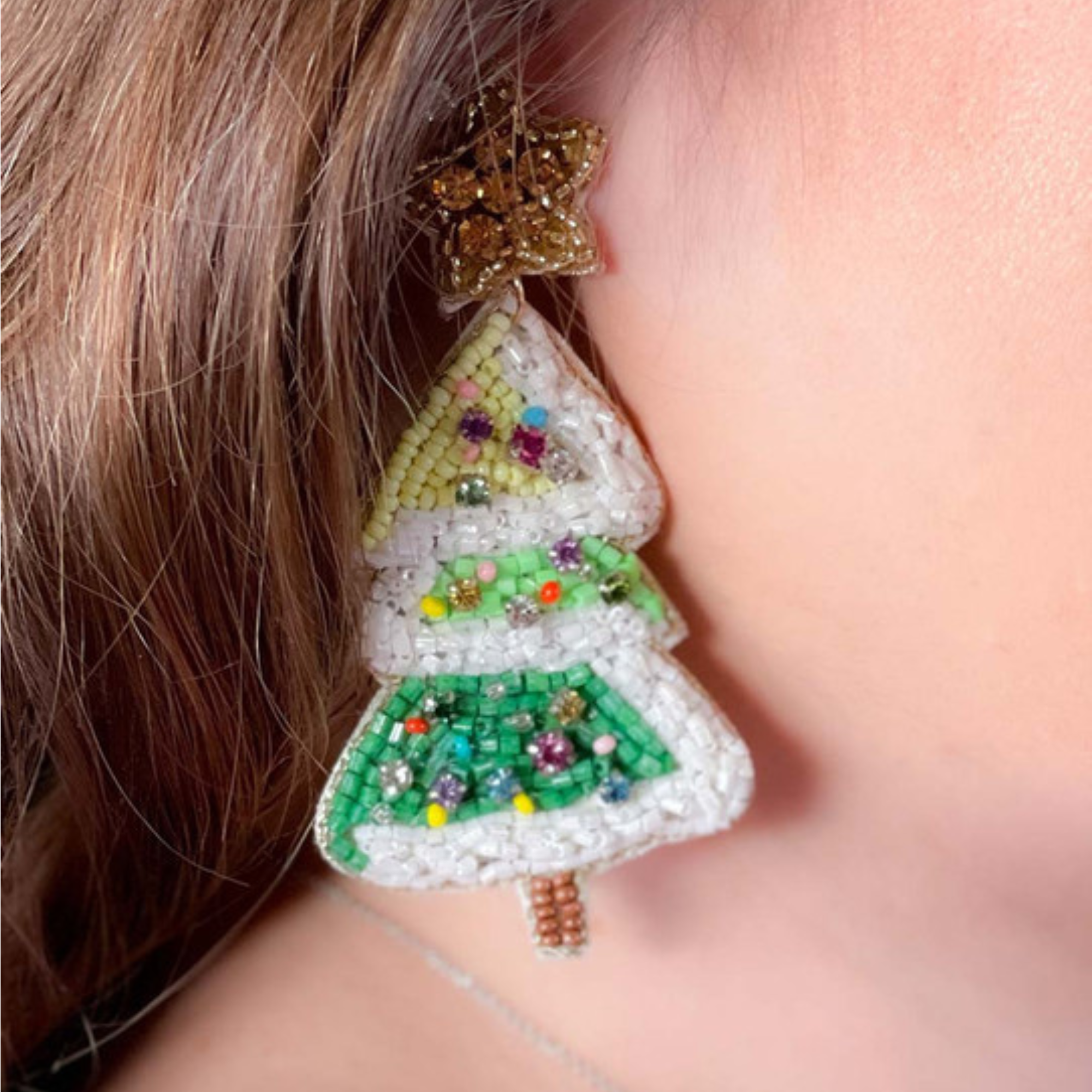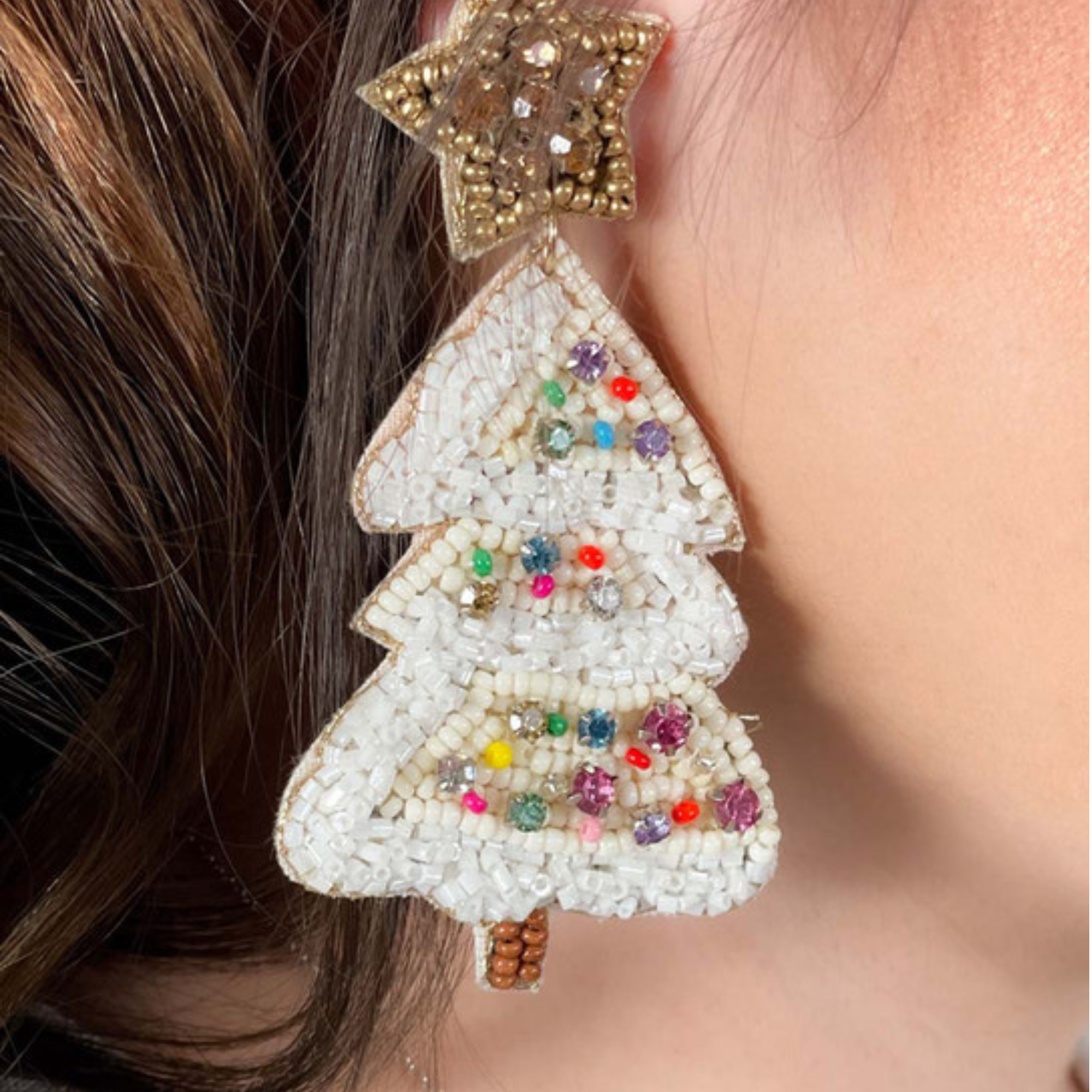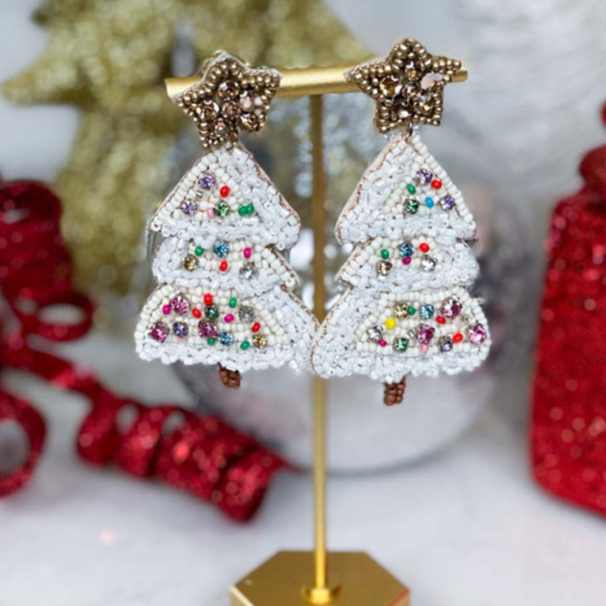 Frosted Snow Christmas Tree Crystal Beaded Artisan Earrings