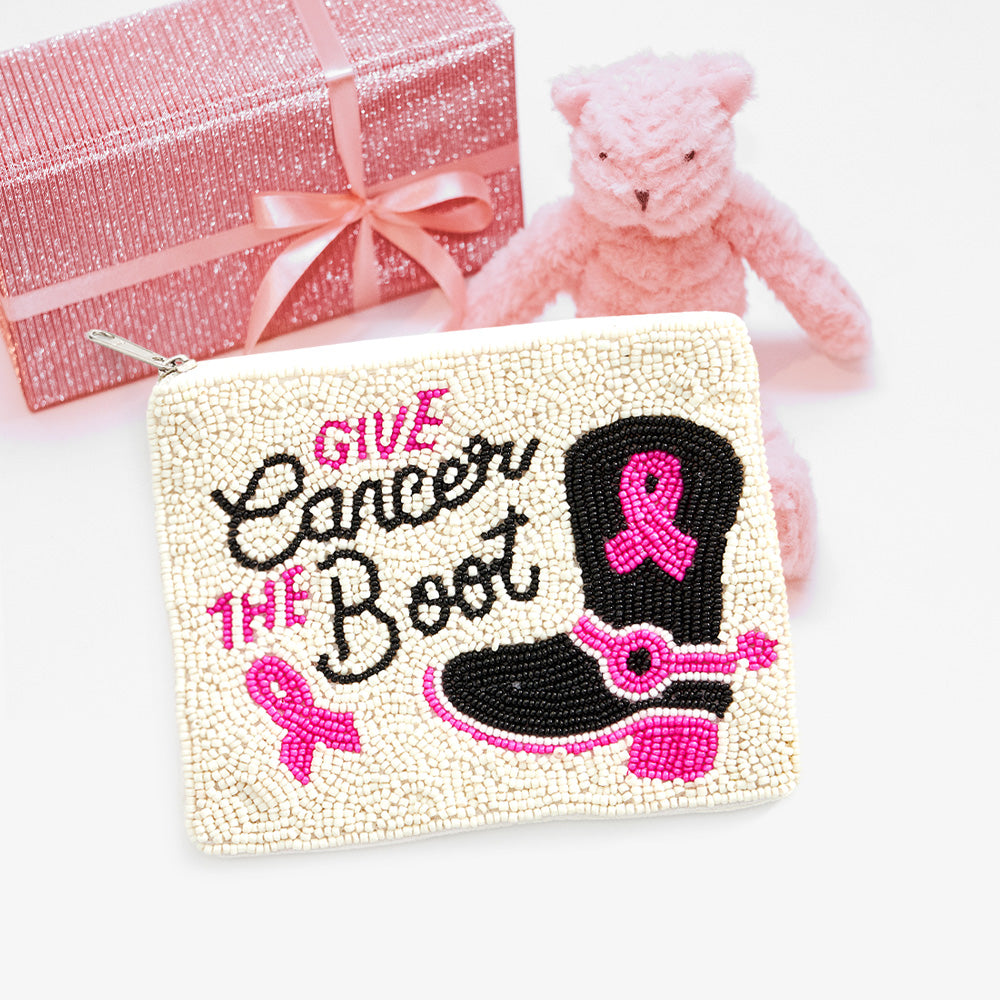 Give Cancer The Boot Beaded Pink Ribbon Mini Pouch Bag