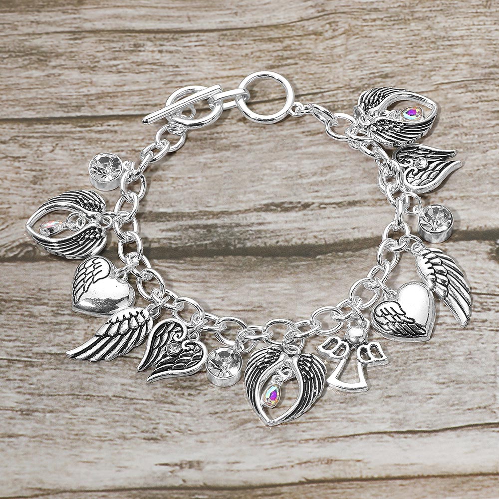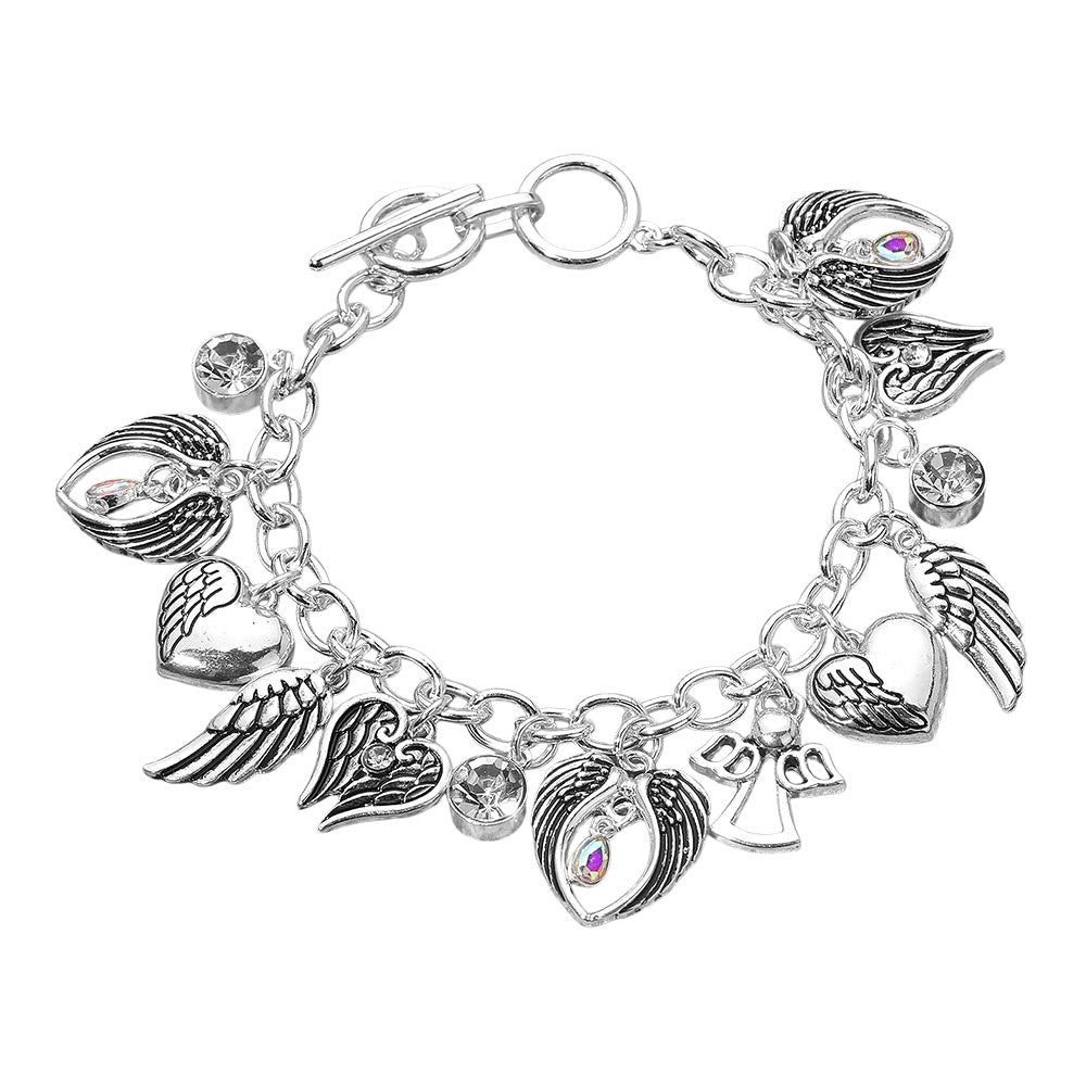 Express your unique style with this angel wing and heart charm chain bracelet featuring detailed symbolic pendants on a bold link chain. Adjustable for a perfect fit, this versatile piece brings a touch of edgy elegance, making it ideal for layering or wearing as a standout accessory.