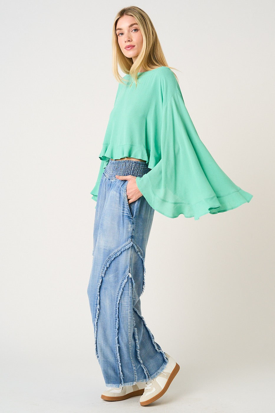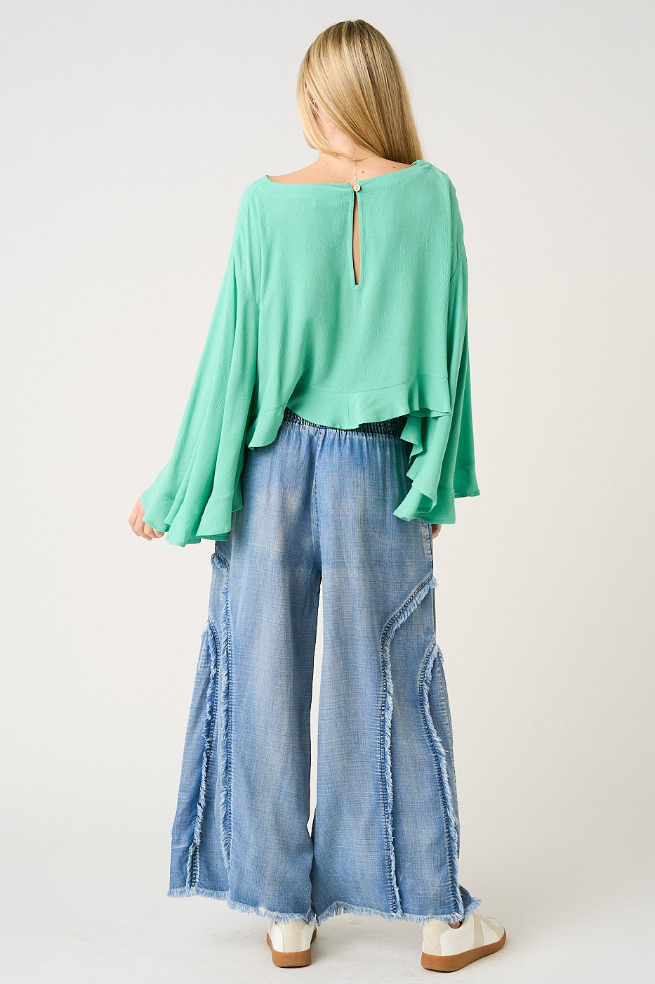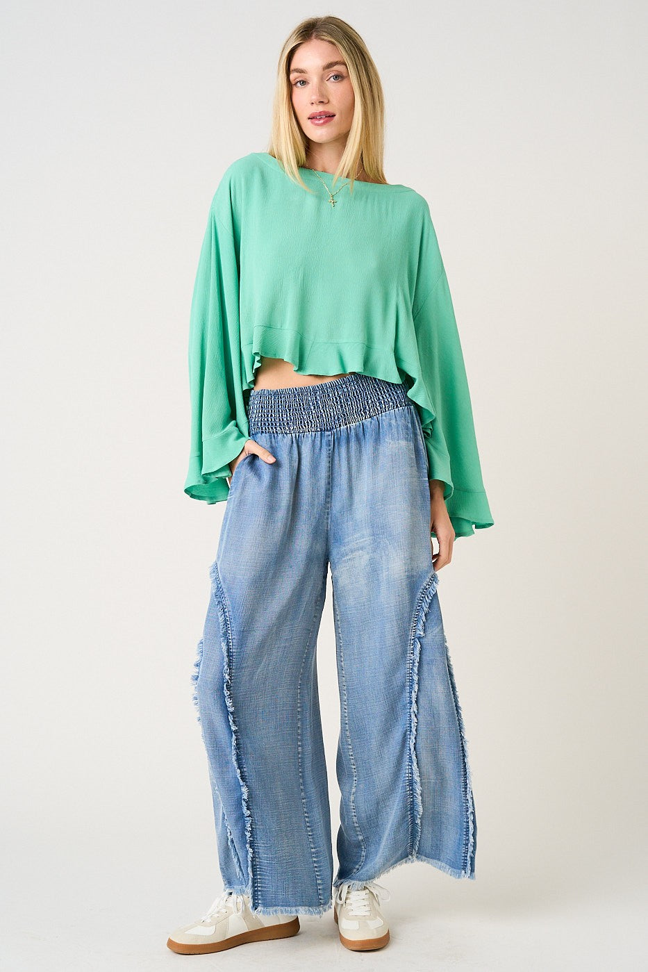 The Janis Tencel Wide Leg Pants are crafted from washed Tencel chambray for a lightweight, breathable feel with that perfectly lived-in denim wash look. A smocked waistband keeps the fit comfy and flattering, while side pockets and a full-length wide-leg silhouette make them an effortless everyday favorite. Finished with curved fringe detailing for a little extra attitude ✨
