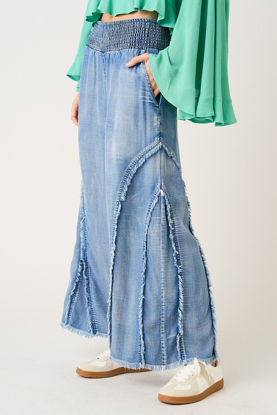 #springstyle #summerstyle #chambraypants #denimwash #smockedwaist #elasticwaist #pockets #widelegpants #bohostyle #bohemianstyle #fringepants #westernstyle #festivalstyle #casualchic #boutiquefashion