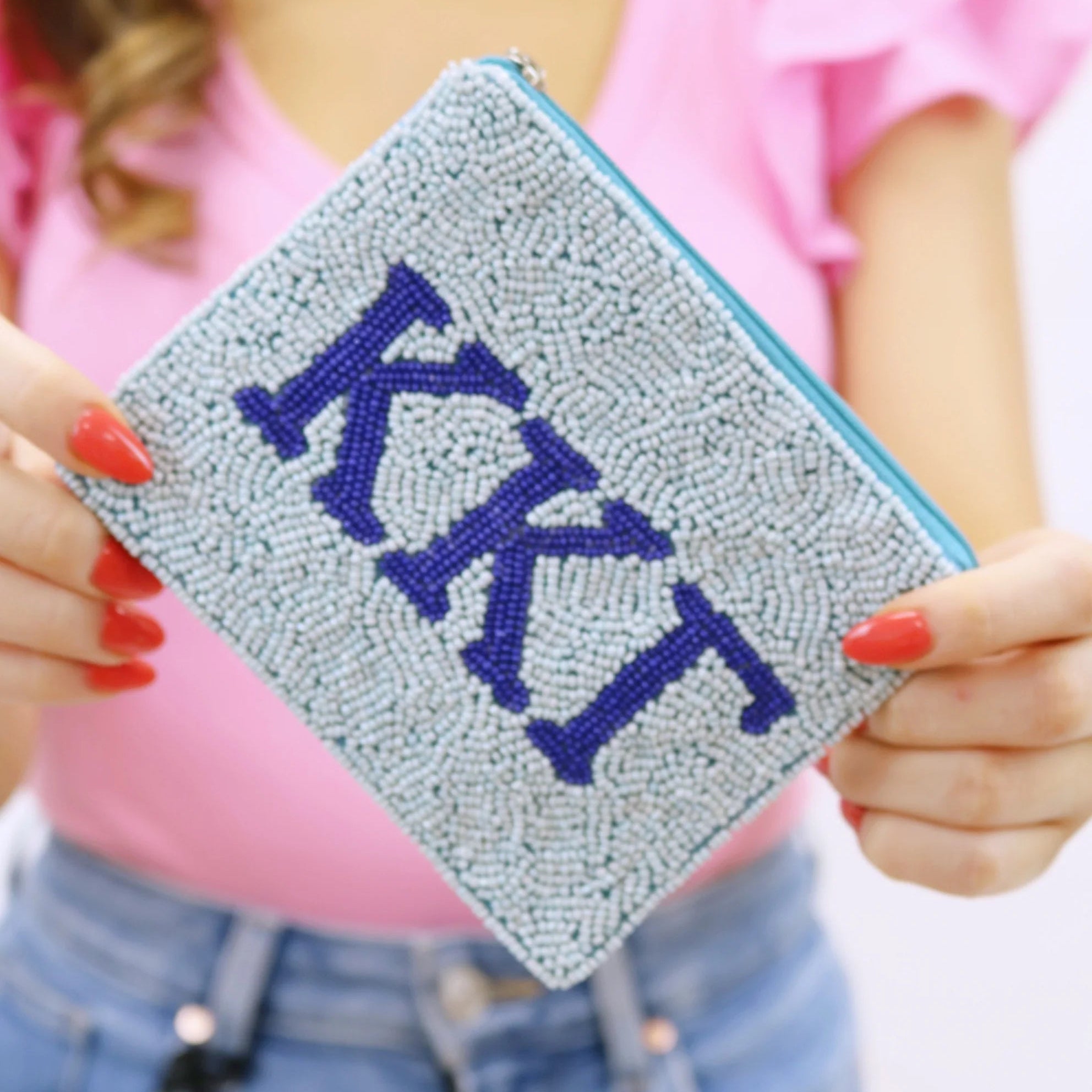 Show off your sorority colors in style with our officially licensed beaded coin pouch. The perfect sorority Big Little gift and clear bag eye candy!