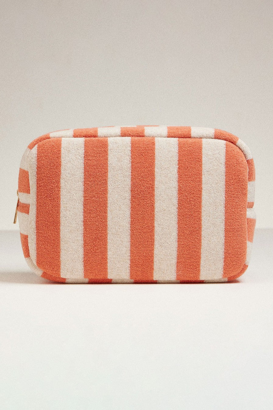 Large Striped Makeup Bag Stay stylish and organized with our striped travel pouch! Crafted from soft, durable fabric, it's perfect for storing your essentials on the go. Grab one now for the perfect blend of fashion and function! Size : 8.5" X 5.5" X 3"Zipper ClosureMaterial : 80% Cotton, 20% Polyester No Inner Pockets
