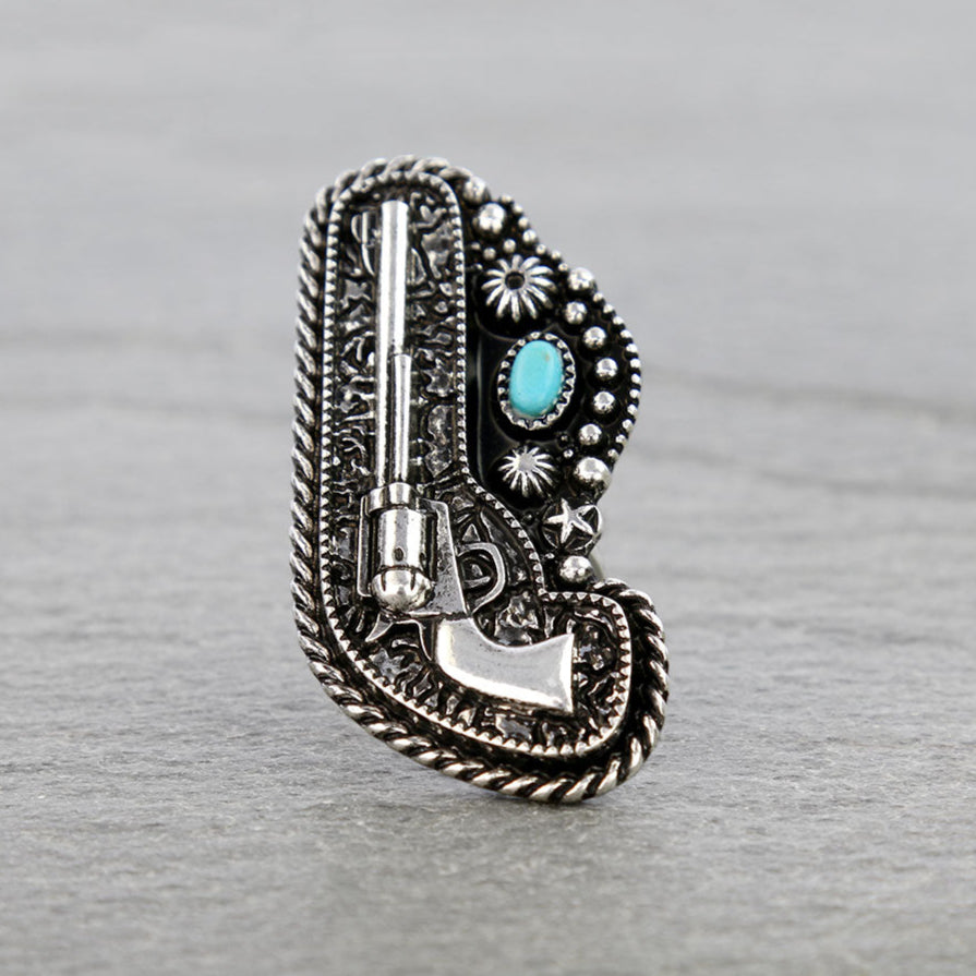 The License To Carry Western Ring is a bold statement piece that embodies rustic charm with a modern edge. Featuring a Turquenite stone set on a silver dura-plated band, this ring captures the spirit of the Wild West while delivering eco-conscious sophistication. Its adjustable cuff-style back ensures a comfortable fit, while the elongated 2.25" length creates a show-stopping silhouette that turns every outfit into a statement look.
