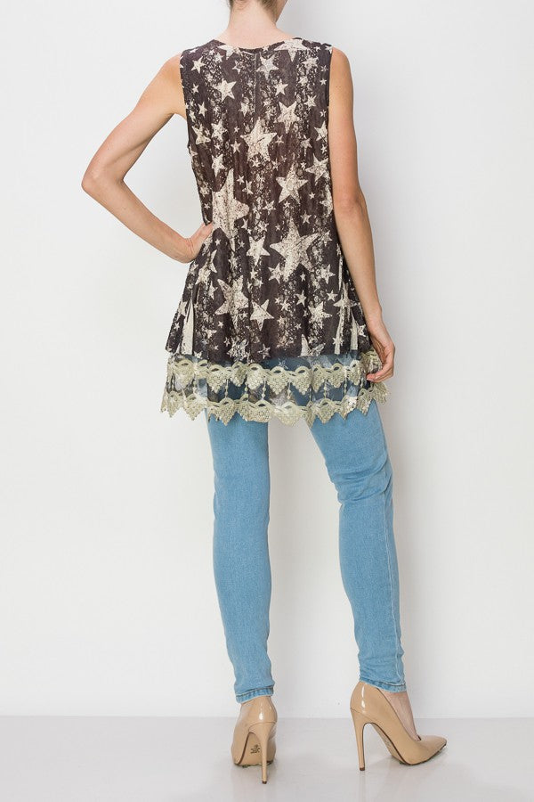 Lola Lined Lace Detail Hi-Lo Tank Top in Black Star