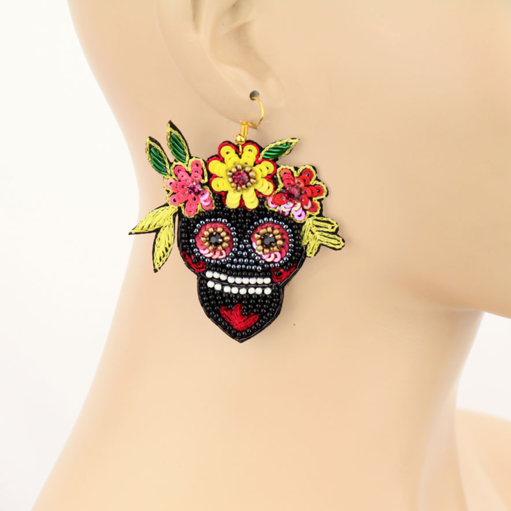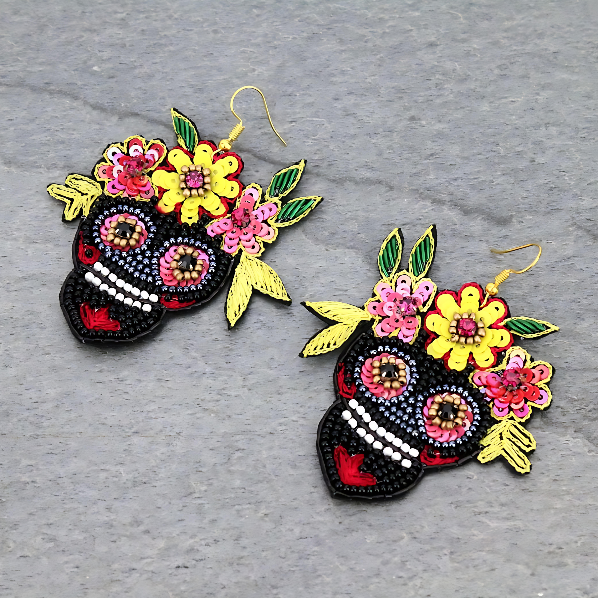 Mardi Gras Beaded Black Sugar Skull Earrings