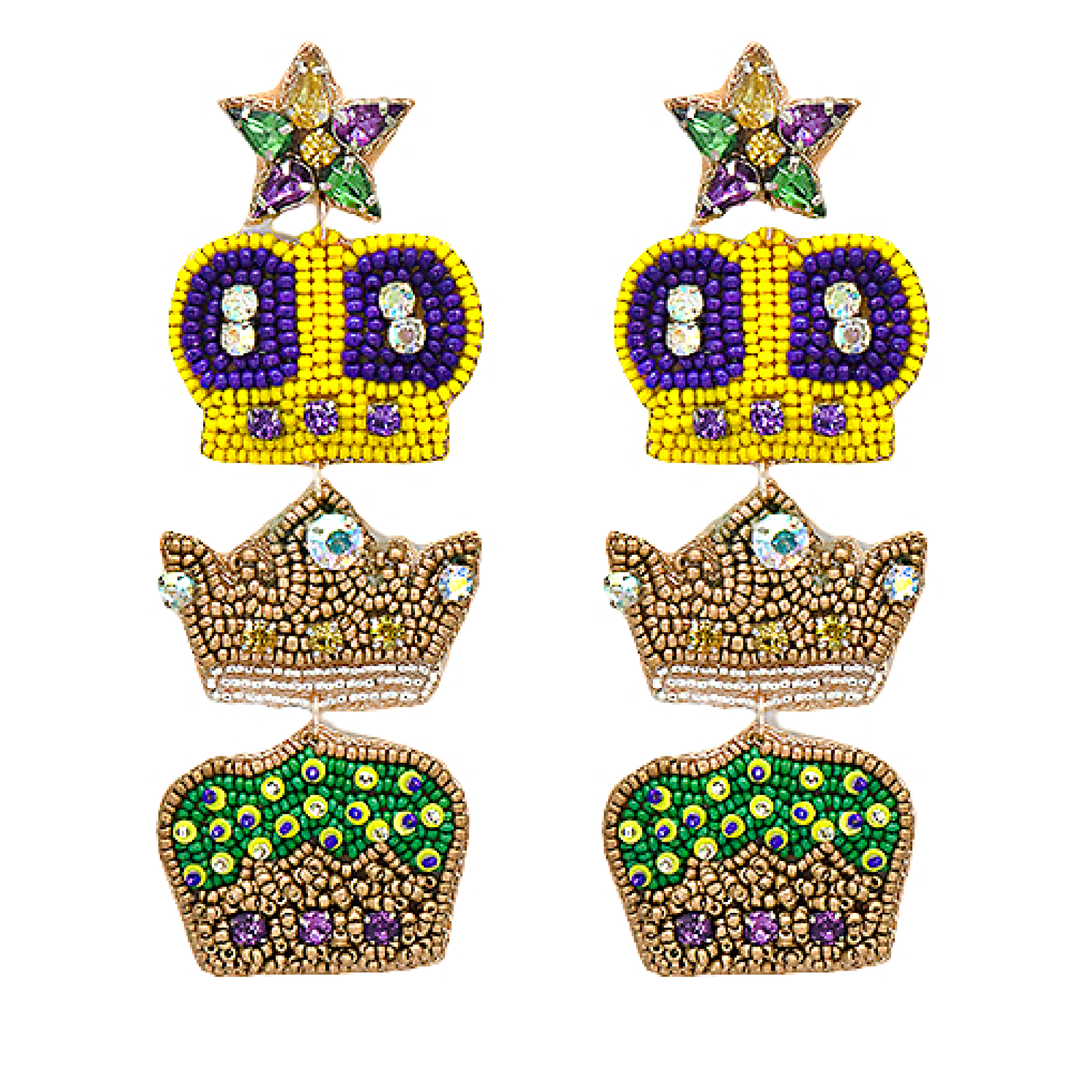 Mardi Gras Jeweled Beaded Triple Crown Earrings
