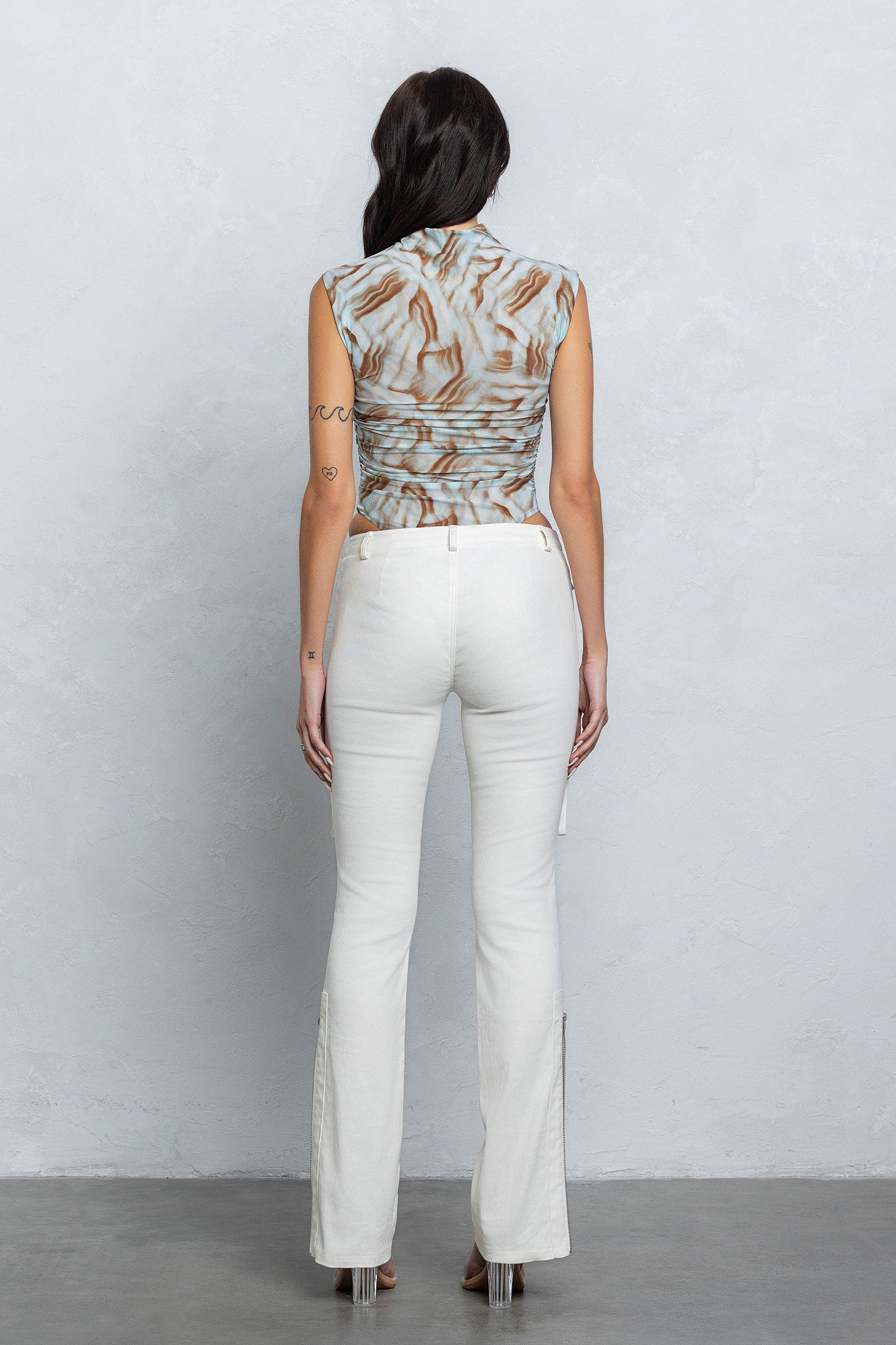 - Printed mesh sleeveless bodysuit- Mock neck- Lining in the front bust area only- Ruching on the sides- Fitted fit- Button closure- Good stretch - Model size 5' 9" ( Wearing S size)