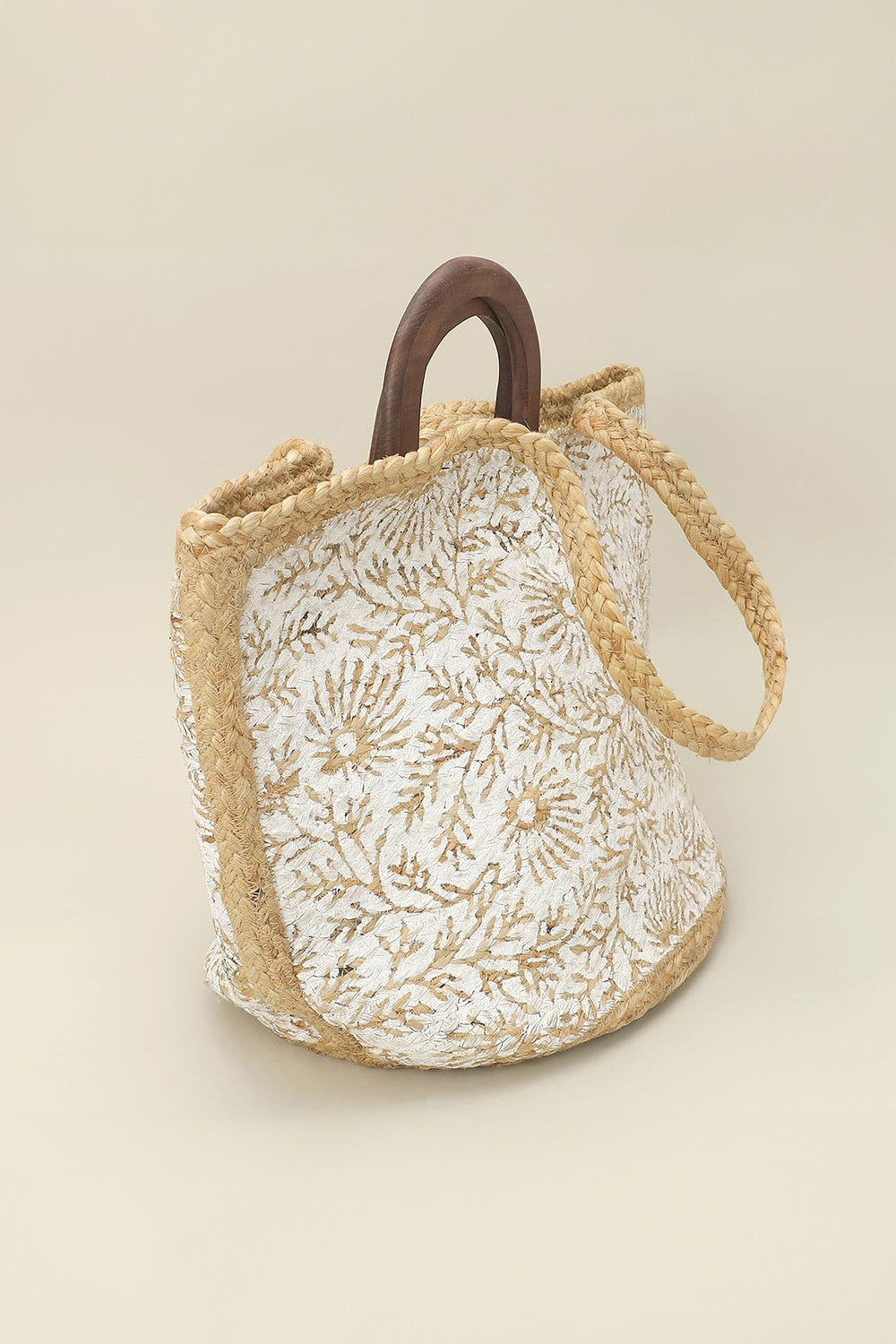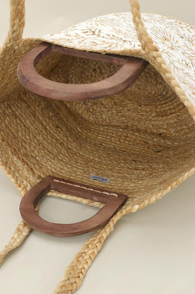 Wooden Handle Floral Raffia Woven Shoulder Bag Spacious structured tote bag designed with a refined textured surface and a stylish top handle for everyday versatility. Roomy interior easily carries daily essentials while maintaining a polished silhouette. Ideal for shopping, travel, or casual outings, making it a great