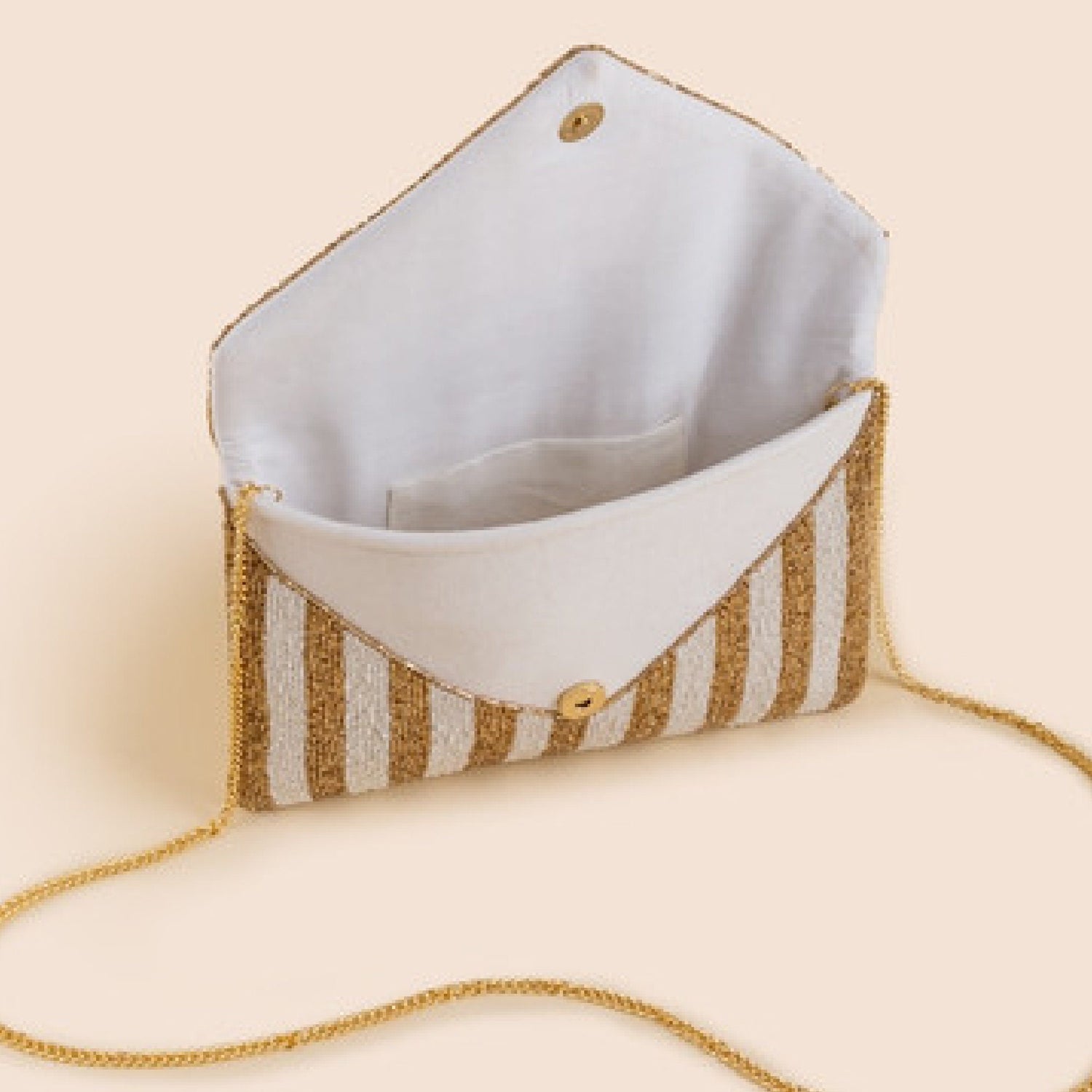 Finished with a gold chain and a fold-over snap button closure.