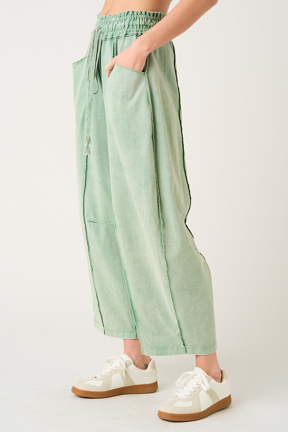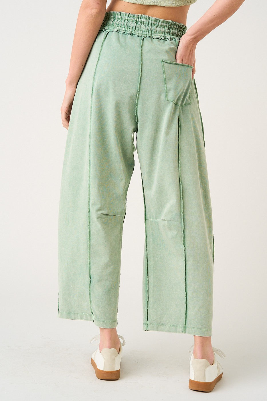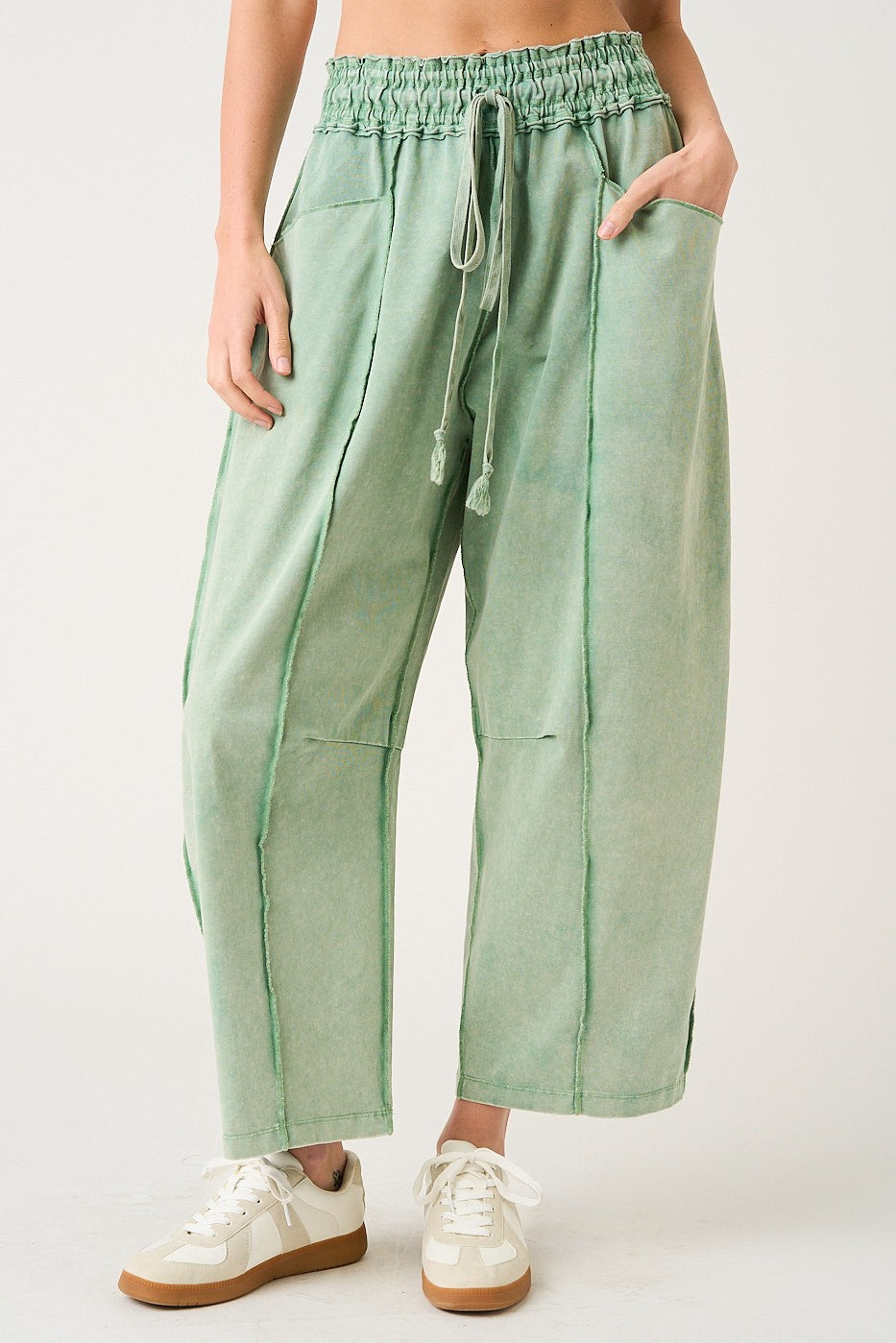 The Mya Festival Ready Barrel Pants are made from cotton French terry knit fabric with a mineral-washed finish for that perfectly lived-in look. Designed with seam and dart details to shape the leg, these pull-on barrel pants feature an elastic waist with drawstring tie, pockets front and back, and an ankle-length cut that works with sandals, sneakers, or boots. Available in Beige or Green 🌿