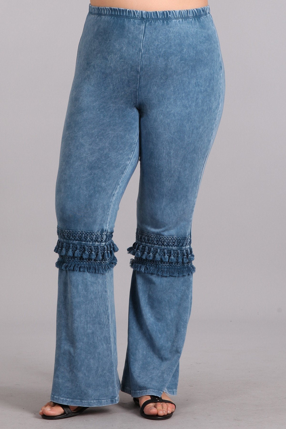 Mineral washed bell bottom pants with fringed crochet lace and elastic waist.