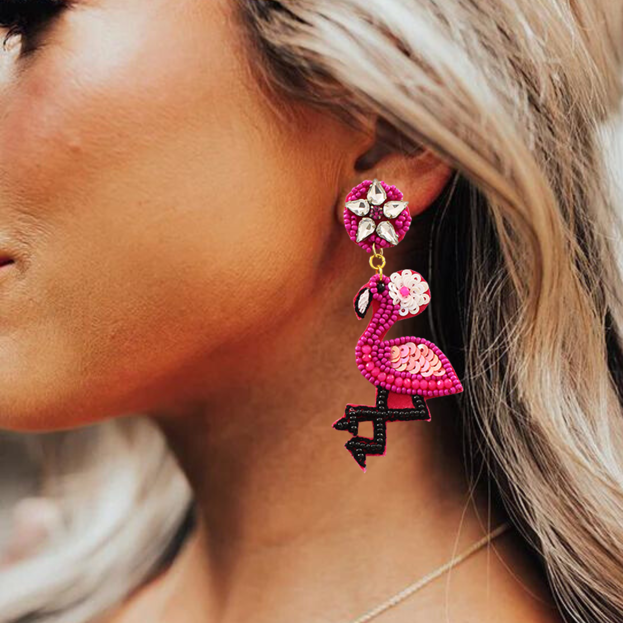 Pink Flamingo Tropical Bird Seed Bead Crystal Earrings