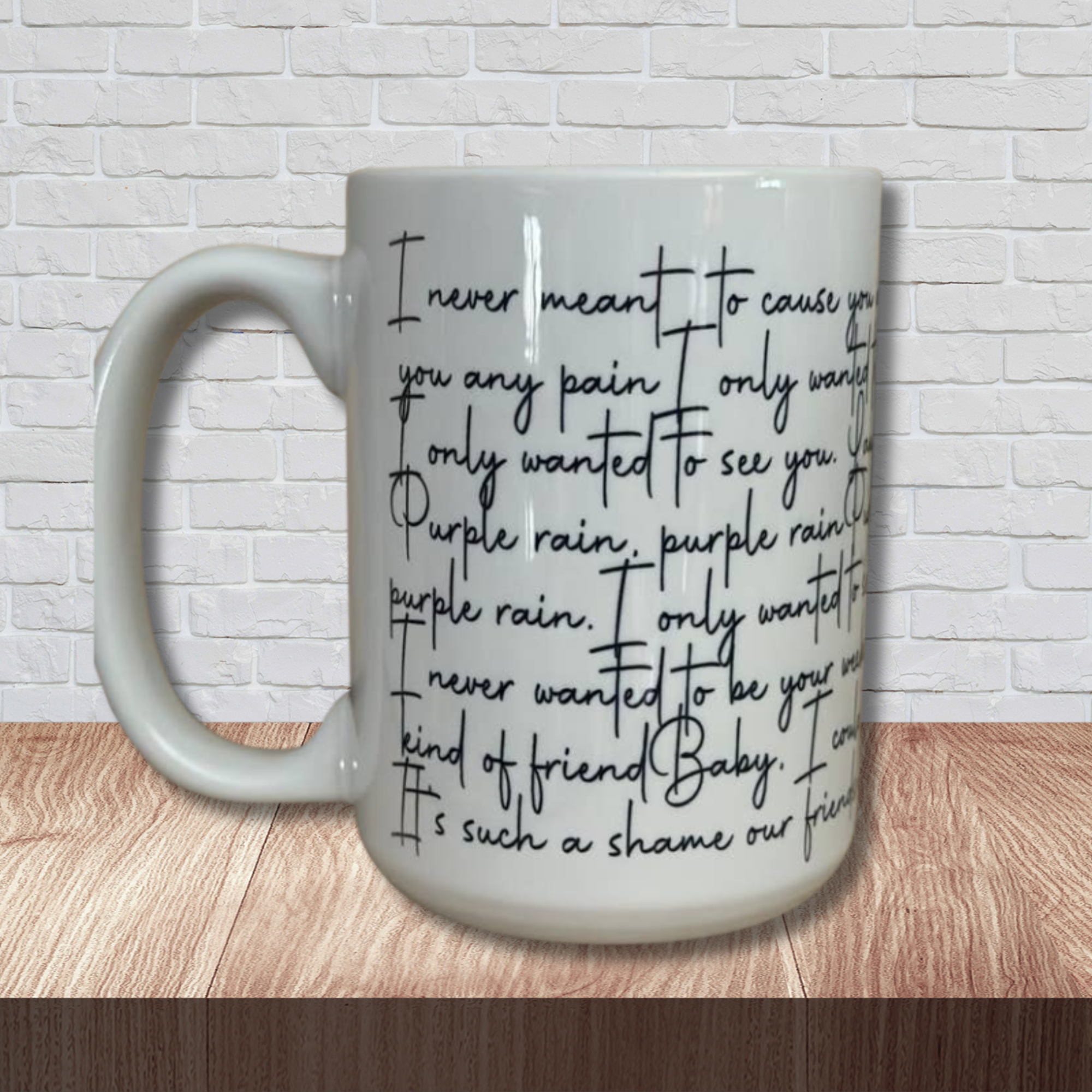 Features the lyrics from Prince's hit song "Purple Rain" in black on a white ceramic mug.