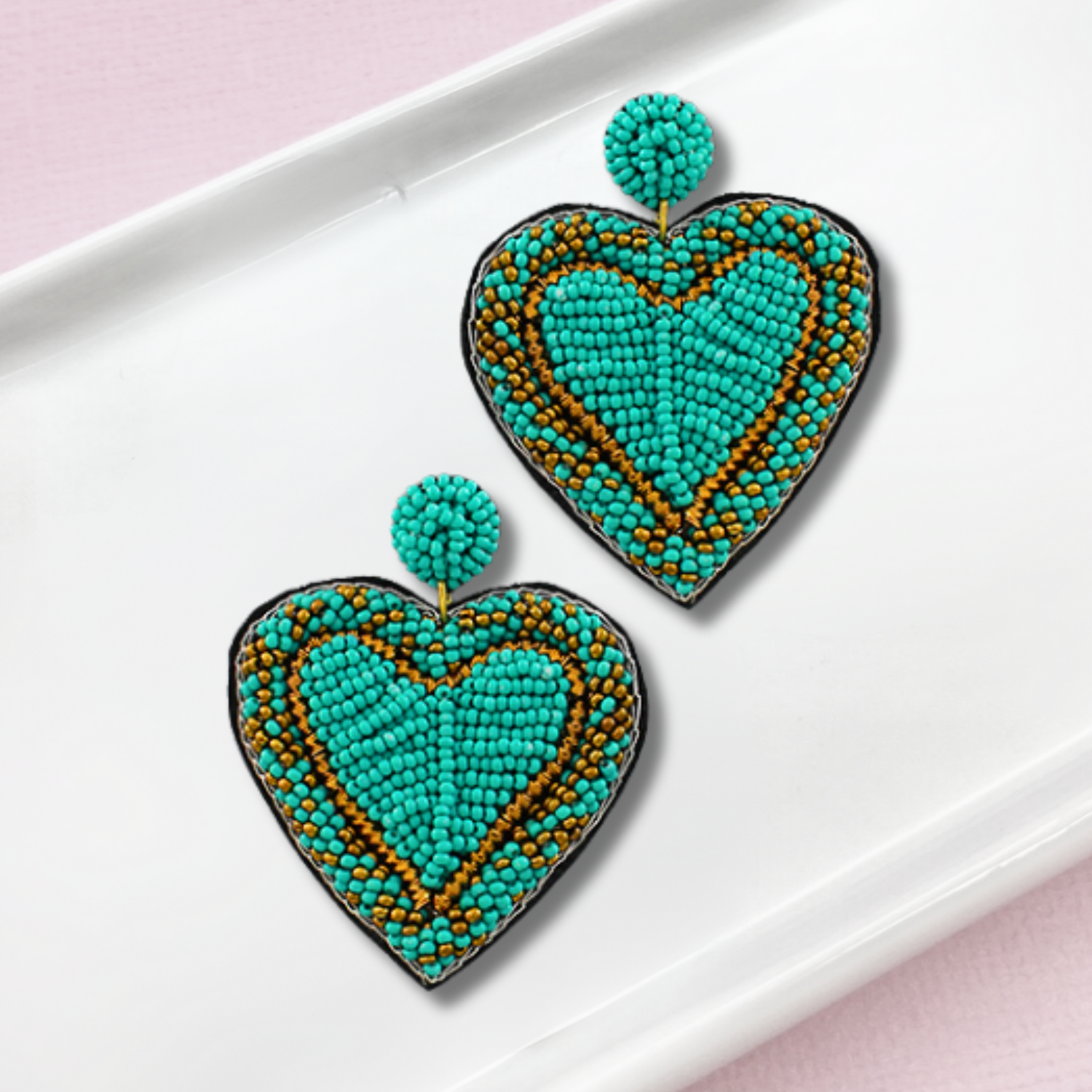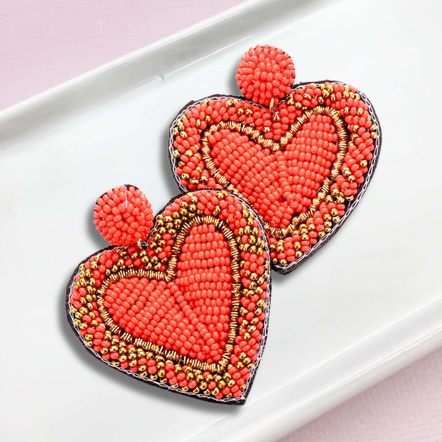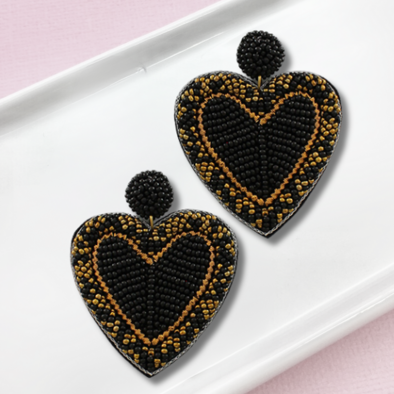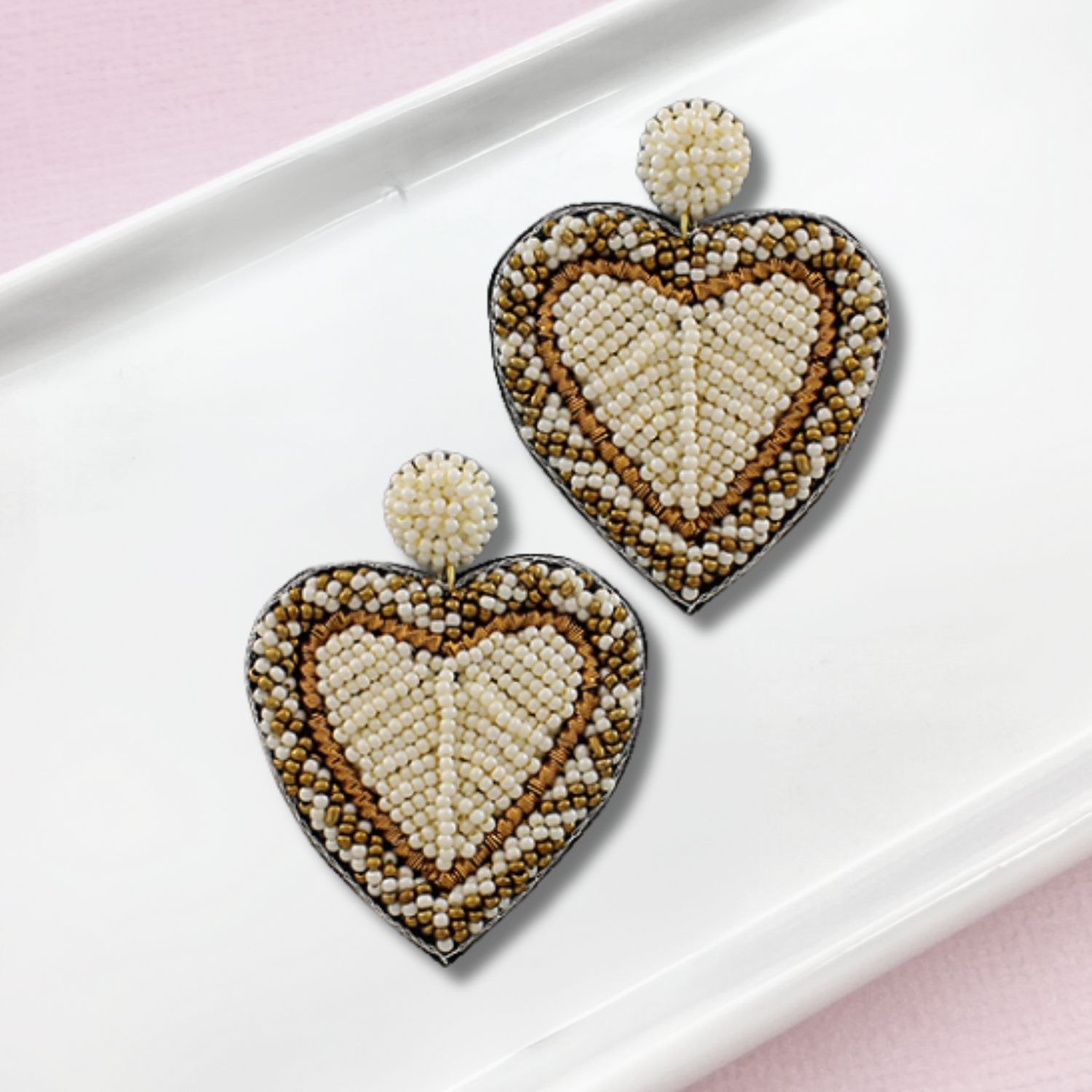 Puffy Heart Metallic Gold Threaded Beaded Earrings