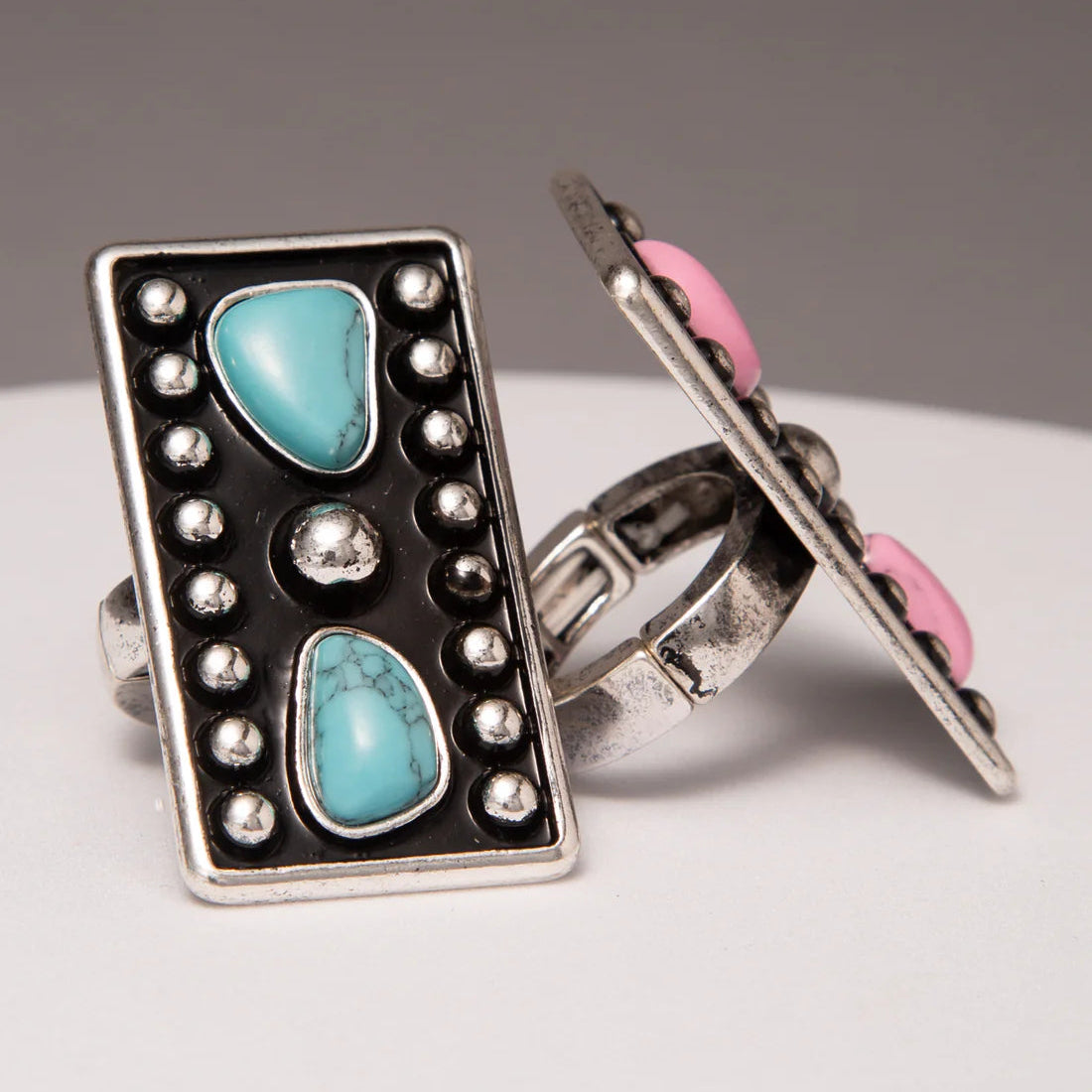 Rock your western edge with the Rectangle Rock Turquoise Ring. Featuring two shimmering stones set in a bold rectangular silver design, this statement piece blends rugged southwestern charm with a touch of modern glam. Available in your choice of pink natural stone or turquoise stone, each ring offers vibrant character and individuality. The stretch-back band ensures a comfortable, flexible fit—perfect for everyday wear or standout western style.