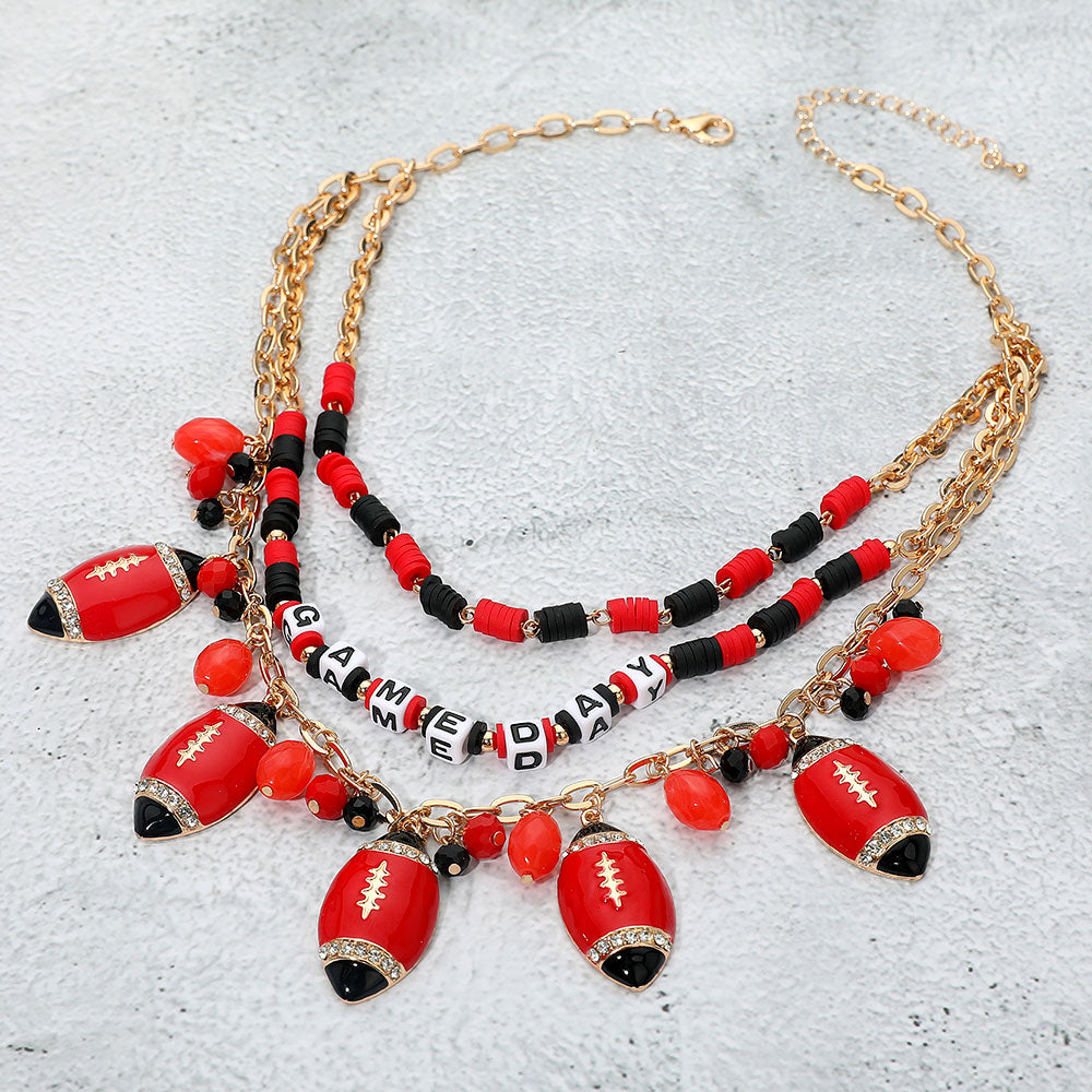This layered gameday necklace blends red and black Heishi beads with football charms and “GAMEDAY” letter beads to energize any fan look. The playful, layered silhouette pairs perfectly with tees, jerseys, and tailgate-ready outfits.