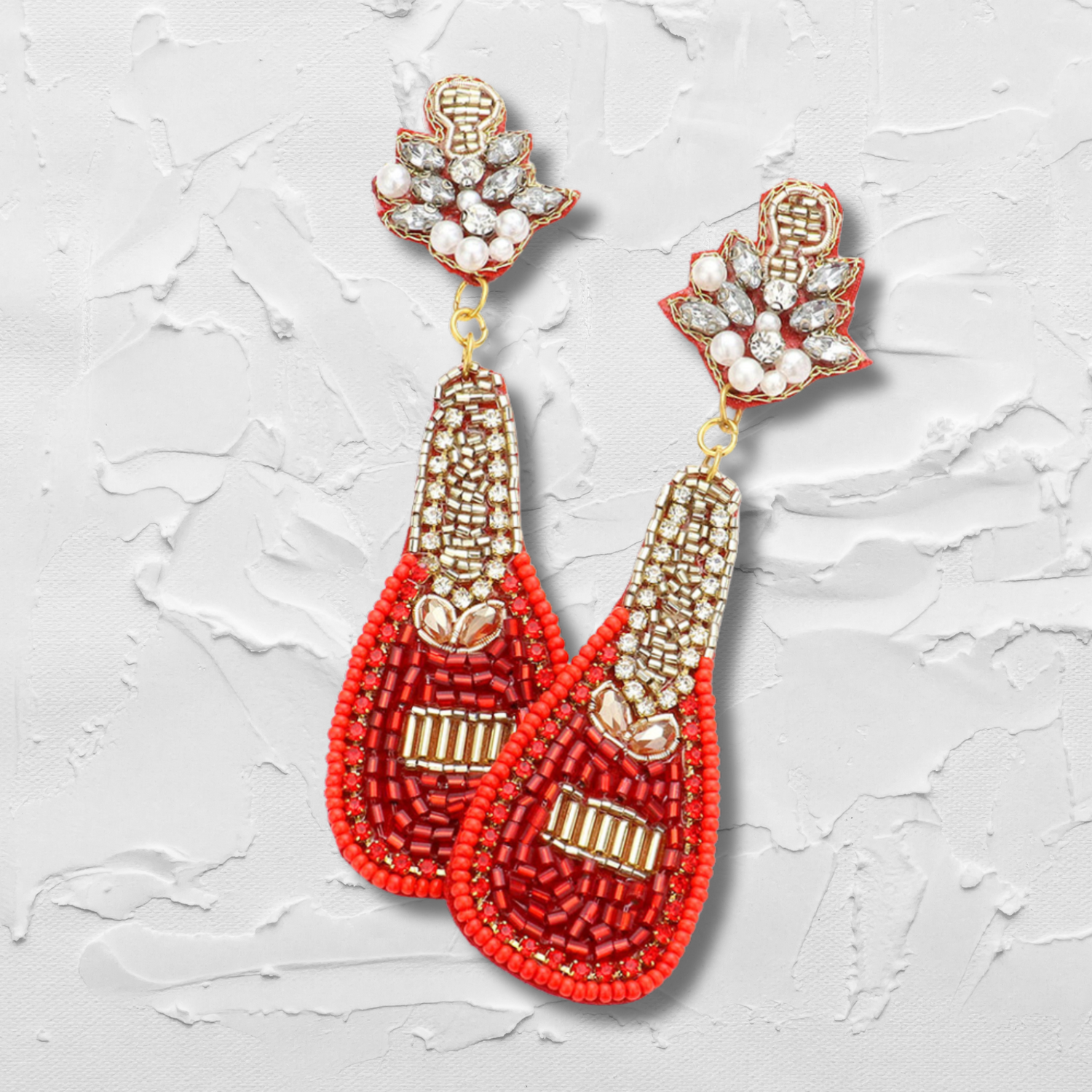 Red Crystal Beaded Champagne Bottle Party Earrings
