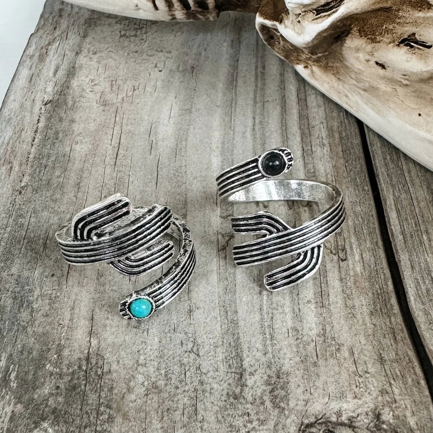 A little desert magic for your everyday stack. The Cactus Wrap Western Ring is a dainty, adjustable wrap ring that hugs the finger in a sculpted cactus silhouette. Choose your vibe: a turquoise-style stone for classic southwestern energy, or sleek onyx for bold midnight cowgirl attitude. Lightweight, comfortable, and perfectly giftable β this oneβs an easy yes for rodeo girls and minimalists alike.Key Features